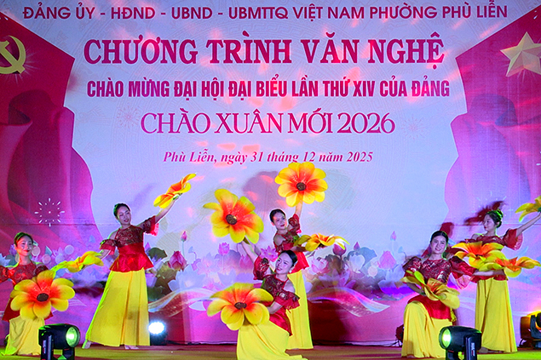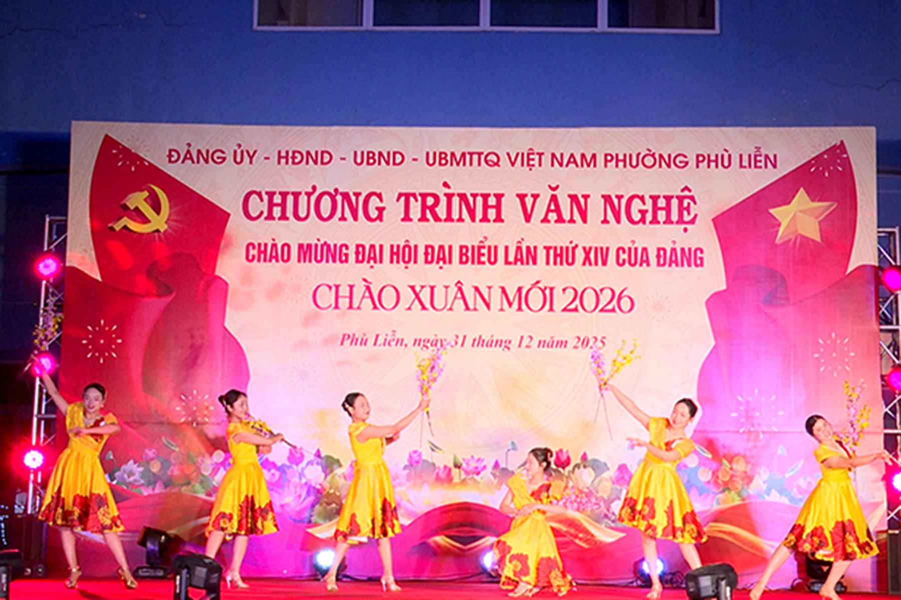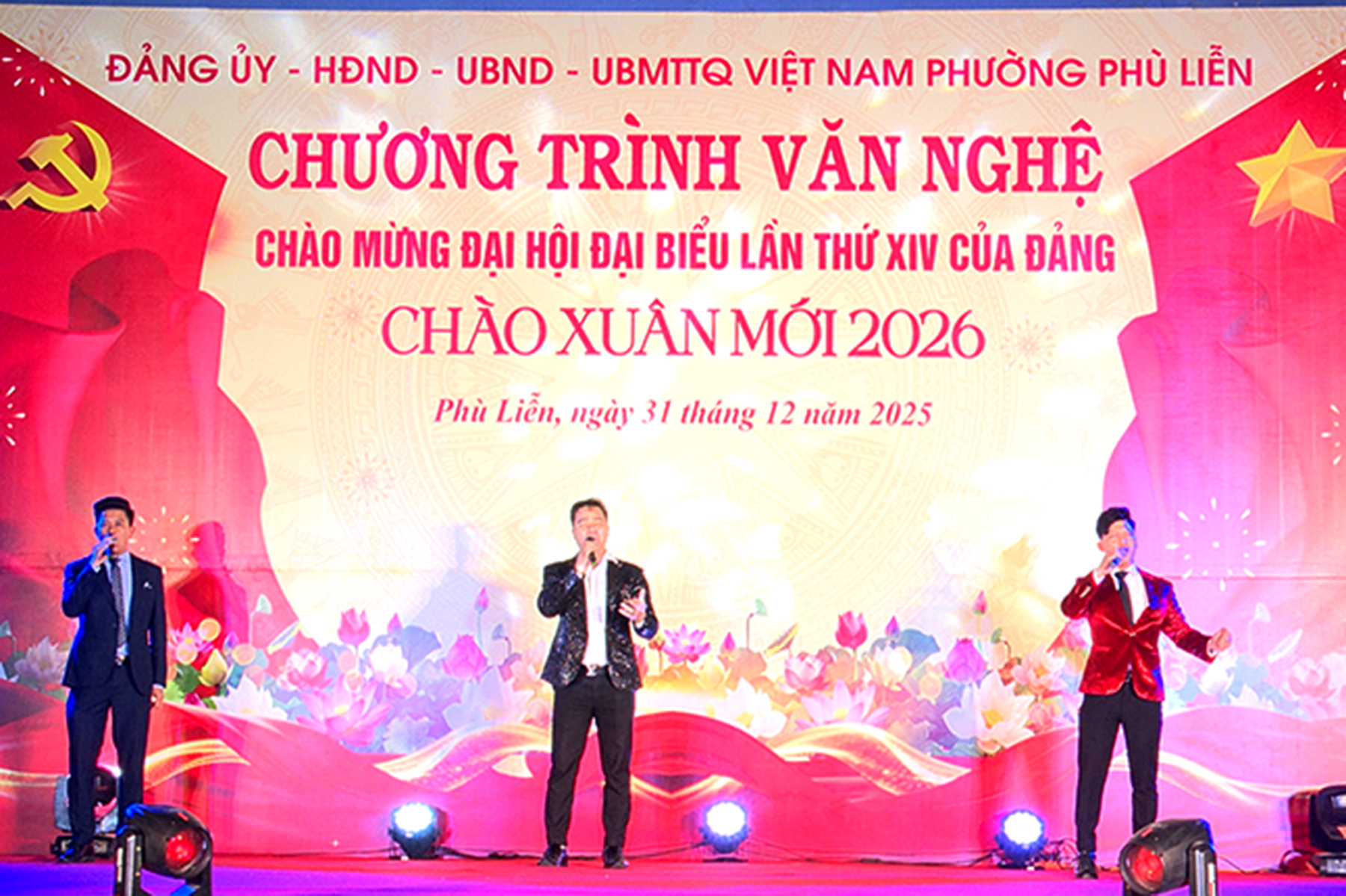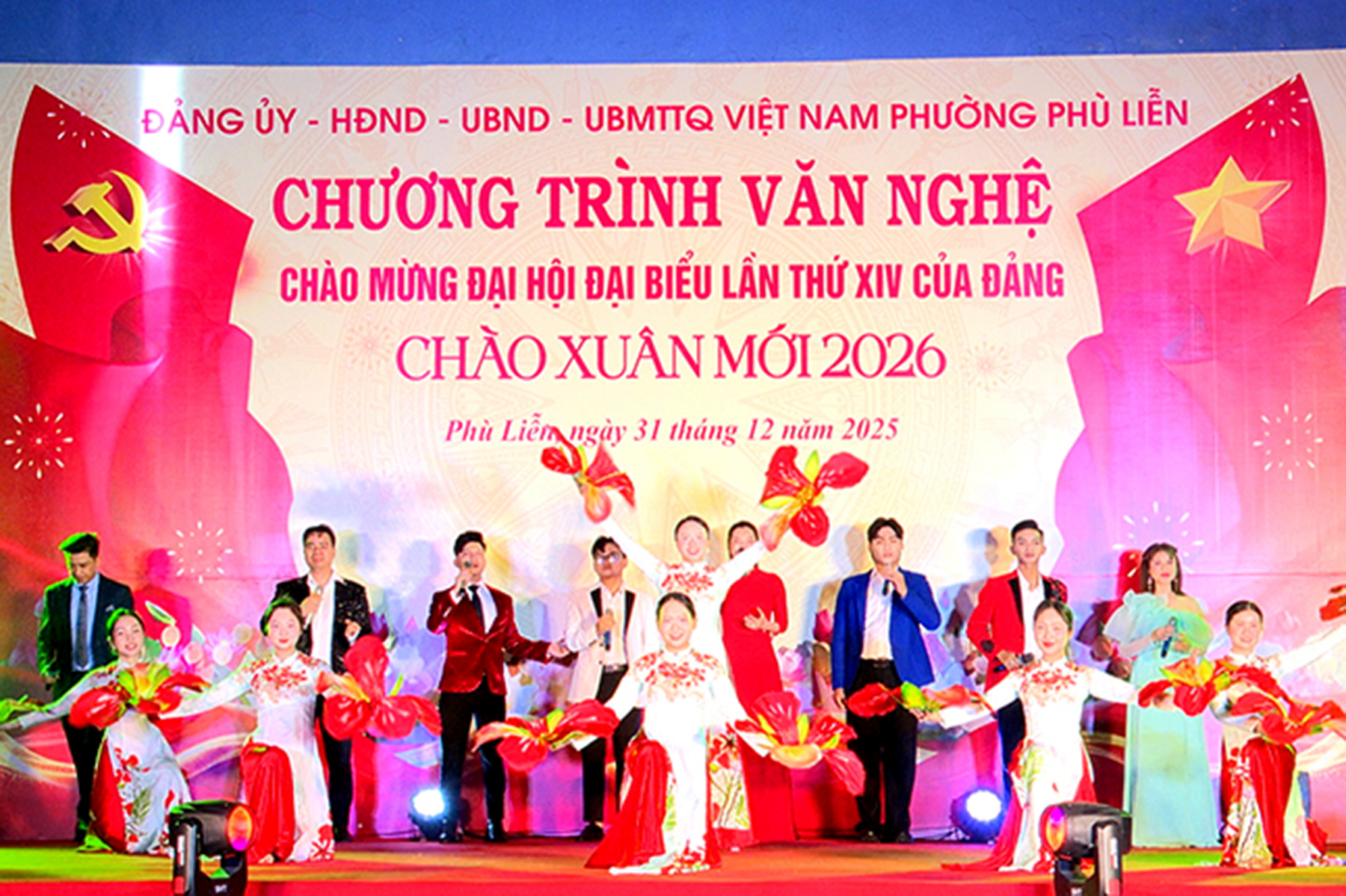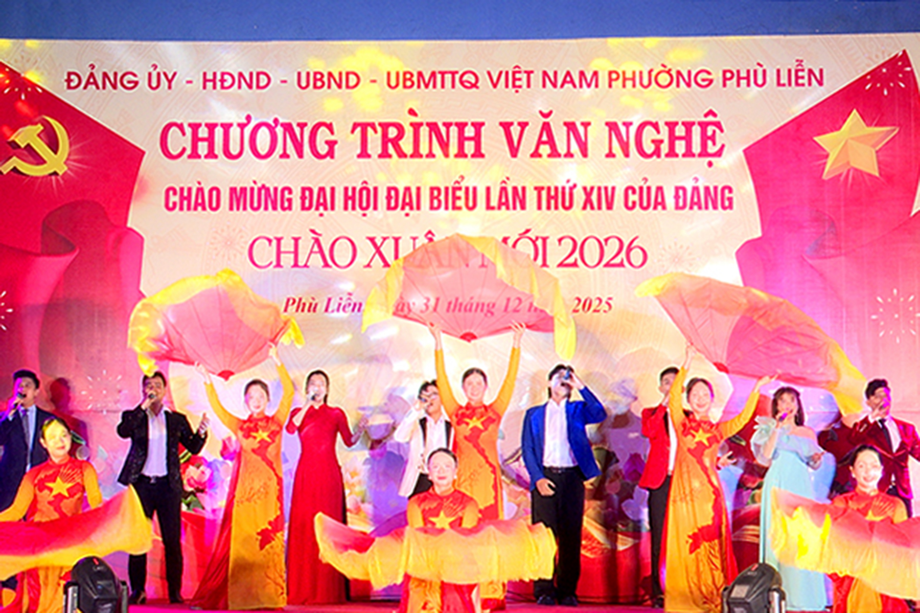 (Haiphong.gov.vn) - Tối 31/12, tại Sân khấu ngoài trời Nhà thi đấu đa năng phường Phù Liễn, Đảng ủy – HĐND – UBND – Ủy ban MTTQ Việt Nam phường tổ chức chương trình văn nghệ chào mừng Đại hội đại biểu lần thứ XIV của Đảng, chào Xuân mới 2026. Tới dự có các đồng chí: Phạm Văn Diện – Chủ tịch UBND phường; Phạm Tiến Thắng - Phó Bí thư Thường trực Đảng ủy phường; Hoàng Thị Minh Thúy - Chủ tịch Ủy ban MTTQ Việt Nam phường.