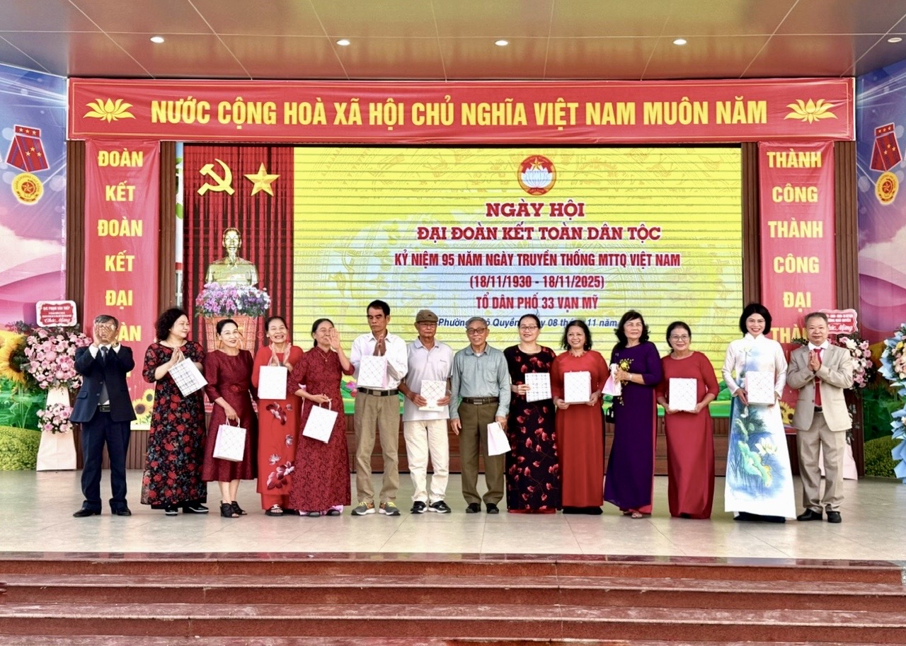 Trao quà cho các hộ gia đình có thành tích xuất sắc trong thực hiện cuộc vận động “Toàn dân đoàn kết xây dựng nông thôn mới, đô thị văn minh” năm 2025.Nhân dịp này, Ban công tác Mặt trận Tổ dân phố phát động phong trào thi đua năm 2026 với các nội dung trọng tâm: đoàn kết phát triển kinh tế, giúp nhau giảm nghèo bền vững; xây dựng đời sống văn hóa, giữ gìn an ninh trật tự, bảo vệ môi trường, phát huy dân chủ ở cơ sở; đồng thời biểu dương, trao quà cho 11 hộ gia đình có thành tích xuất sắc trong thực hiện cuộc vận động “Toàn dân đoàn kết xây dựng nông thôn mới, đô thị văn minh” năm 2025./.