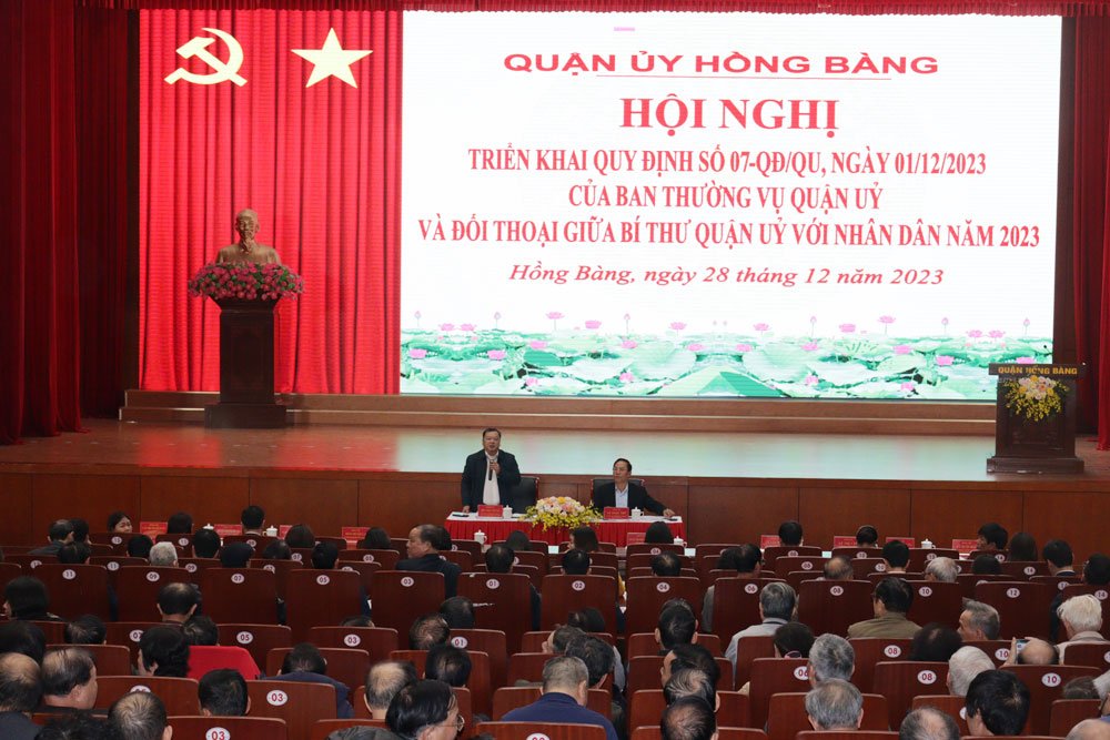 (Haiphong.gov.vn) - Chiều 28/12, Quận ủy Hồng Bàng tổ chức Hội nghị triển khai Quy định số 07-QĐ/QU, ngày 01/12/2023 của Ban Thường vụ Quận ủy về đối thoại giữa người đứng đầu cấp ủy, chính quyền các cấp với Nhân dân và tổ chức Hội nghị đối thoại giữa Thường trực Quận ủy với Nhân dân năm 2023. Đồng chí Lê Ngọc Trữ, Ủy viên Ban Thường vụ Thành ủy, Bí thư Quận ủy chủ trì Hội nghị. Cùng dự có đại diện lãnh đạo Ban Dân vận Thành ủy; Thường trực Quận ủy, lãnh đạo phòng, ban trong quận.