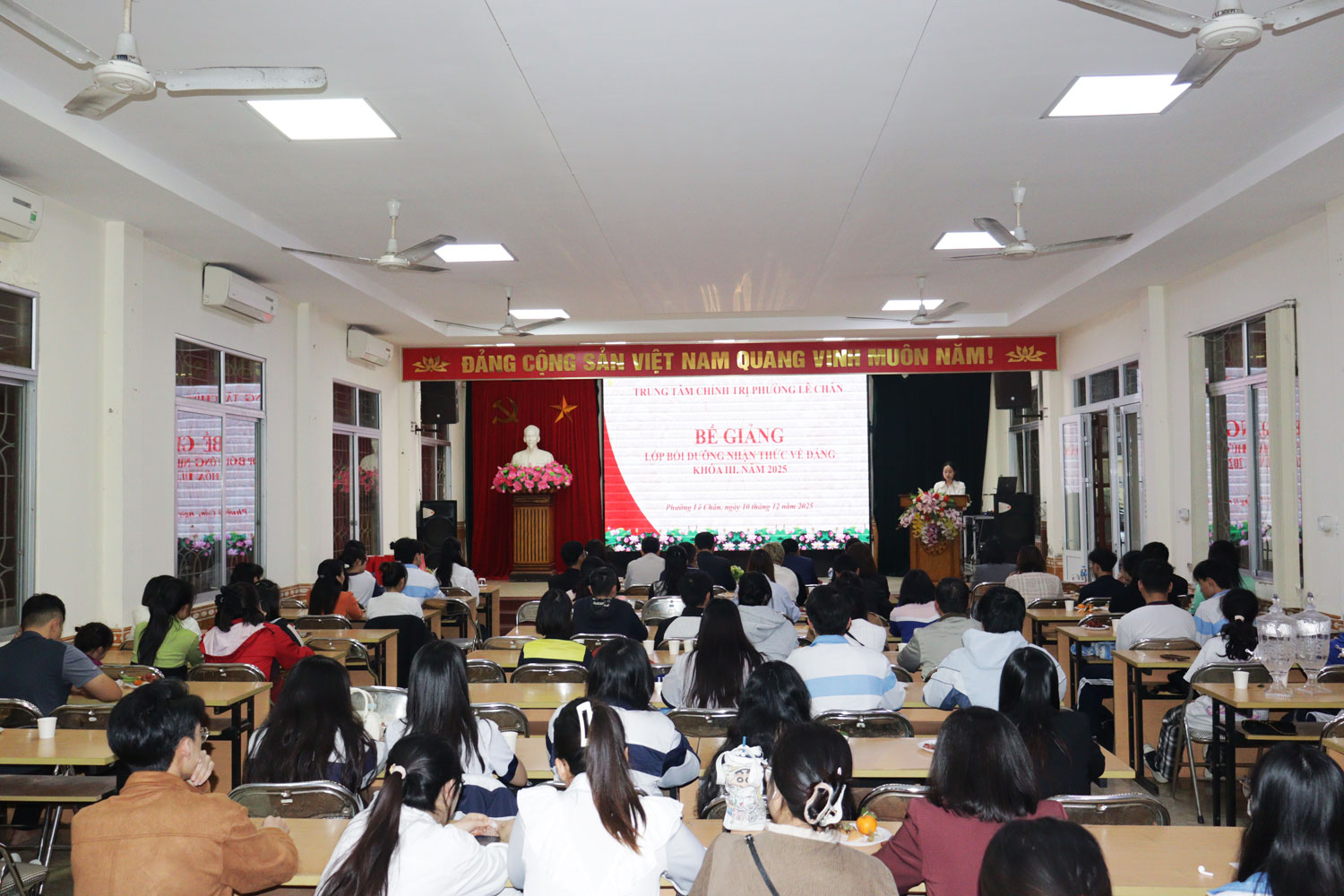 Quang cảnh Lễ bế giảng.Lớp bồi dưỡng nhận thức về Đảng khóa III năm 2025 được tổ chức trong thời gian từ ngày 6/12 - 10/12/2025. Tham gia lớp bồi dưỡng có 83 quần chúng ưu tú trực thuộc các chi, đảng bộ cơ sở thuộc Đảng bộ phường Lê Chân và phường An Biên.