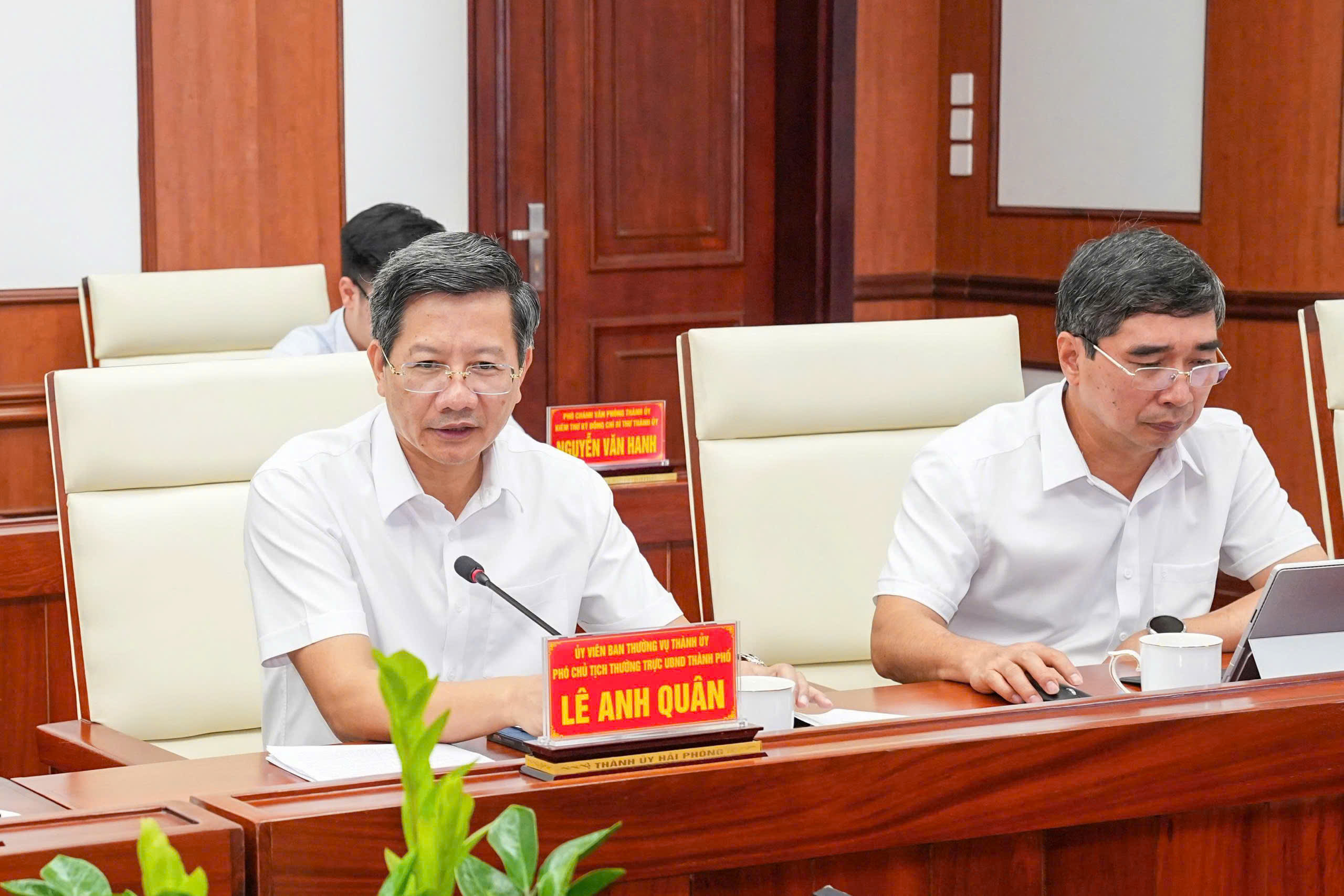 Phó Chủ tịch Thường trực UBND thành phố Lê Anh Quân phát biểu tại cuộc làm việc.Đồng chí Bí thư Thành ủy nhấn mạnh, hiện có 2 dự án là: Dự án tuyến đường kết nối Đông Tây; trục kết nối sân bay Gia Bình - cảng Lạch Huyện có nhiều triển vọng hợp tác với Tập đoàn Xây dựng Thái Bình Dương theo hình thức BT. Trong đó, dự án tuyến đường kết nối Đông Tây đã được Ban Thường vụ Thành ủy cho ý kiến về chủ trương đầu tư, dự kiến khởi công và đầu năm 2026. Đồng chí giao UBND thành phố làm việc với Tập đoàn thống nhất phương án đầu tư Dự án kết nối sân bay Gia Bình - cảng Lạch Huyện và phấn đấu khởi công trong năm 2026. Đồng chí đánh giá cao thiện chí của Tập đoàn trong hỗ trợ thành phố dự án xử lý nước chống ngập và giao UBND thành phố chỉ đạo Sở Xây dựng, Viện Quy hoạch khẩn trương làm việc với Tập đoàn sớm có kết quả báo cáo lãnh đạo thành phố.