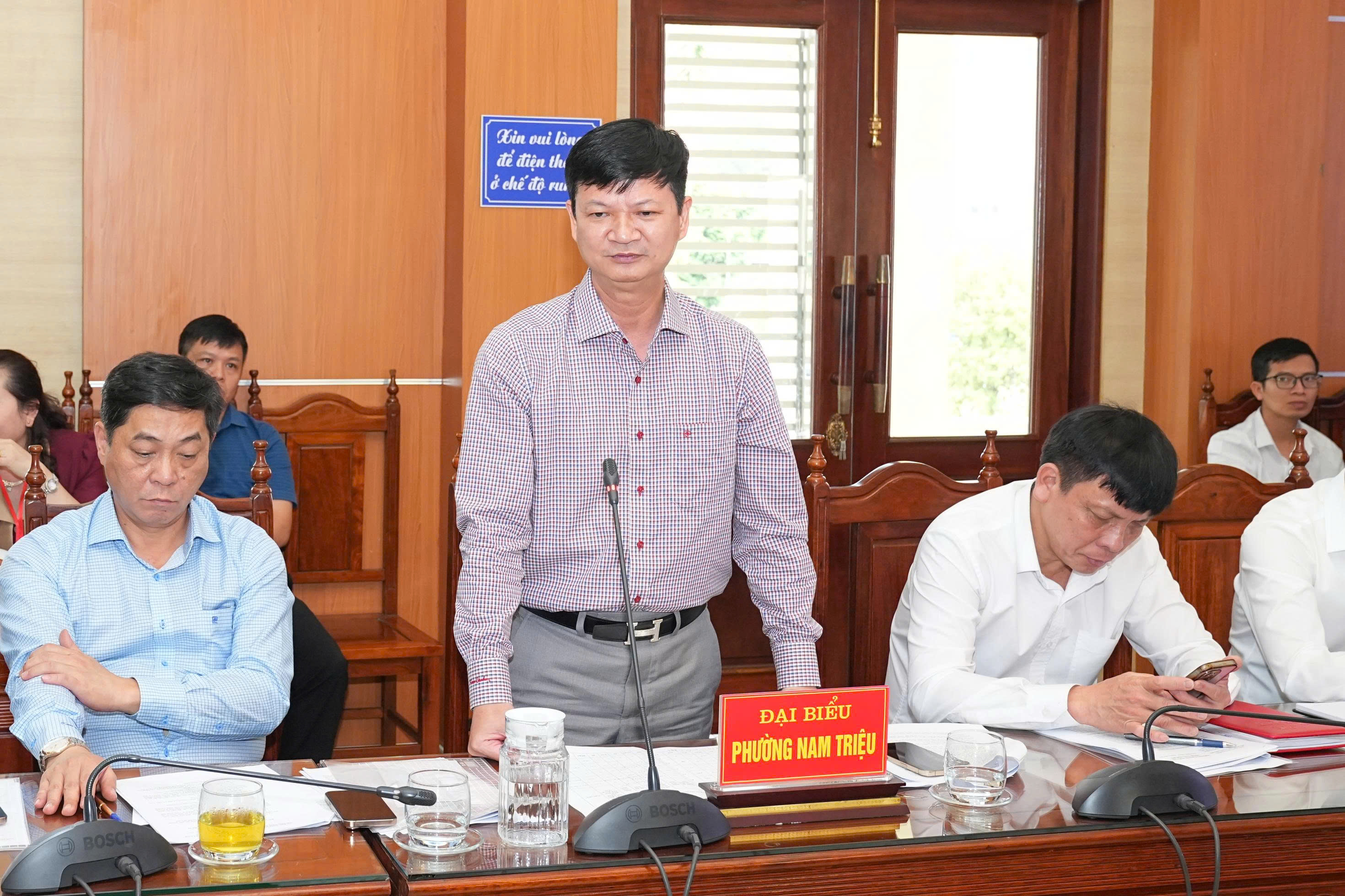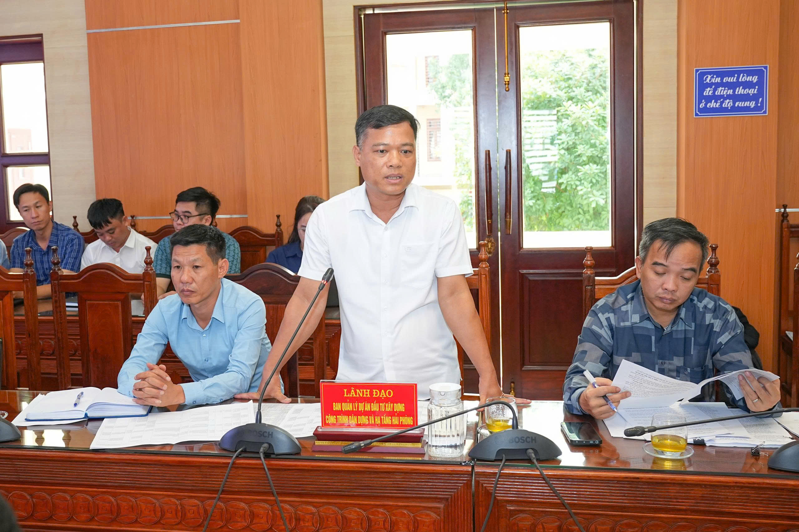 Lãnh đạo phường Nam Triệu báo cáo tại cuộc họp.Tại phường Nam Triệu, hiện có 3 dự án hoán đổi đất quốc phòng (5 điểm) do Ban Quản lý dự án đầu tư xây dựng công trình dân dụng Hải Phòng làm chủ đầu tư với tổng diện tích hơn 42ha. Khu vực có 35 hộ dân sử dụng đất không có giấy tờ, 11 hộ hết hoặc sắp hết hạn sử dụng đất. Phó Chủ tịch Thường trực đề nghị Sở Nông nghiệp và Môi Trường sớm có ý kiến về phương án bồi thường, hỗ trợ các hộ dân, đồng thời yêu cầu chủ đầu tư nghiên cứu giải pháp đảm bảo tiêu thoát nước, phục vụ sản xuất nông nghiệp và neo đậu tàu thuyền của ngư dân.