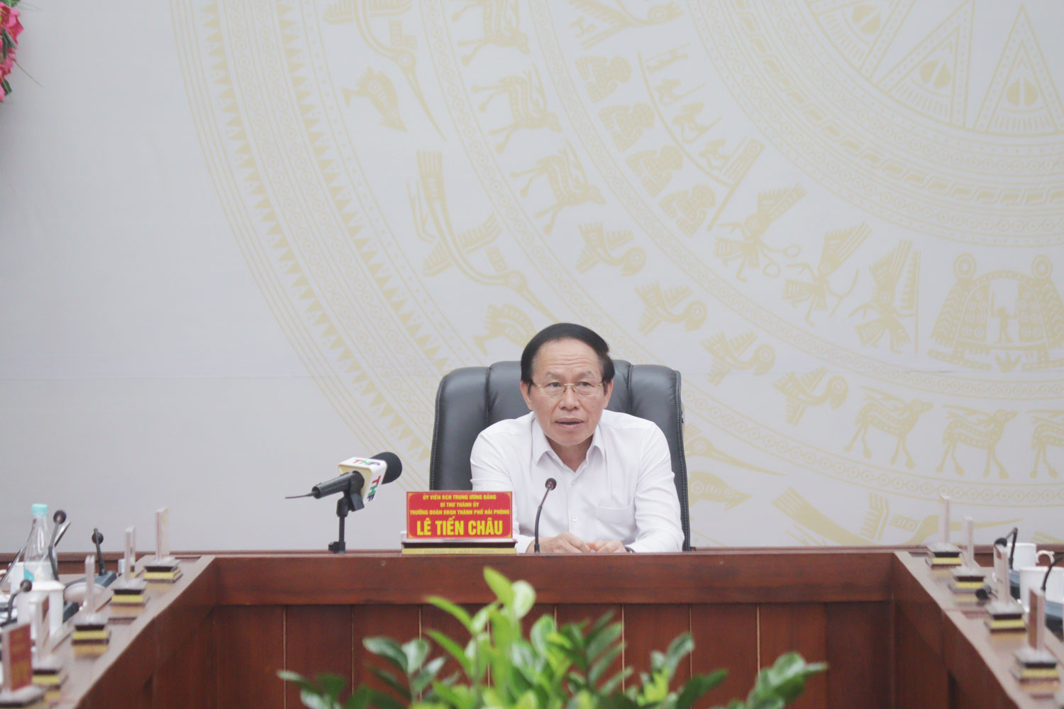 Chủ tịch UBND thành phố Lê Ngọc Châu phát biểu tại cuộc họp.Theo báo cáo, về tiến độ thành lập Khu kinh tế chuyên biệt Hải Phòng, đến nay, Ban Quản lý Khu kinh tế Hải Phòng đã hoàn thiện Đề án thành lập Khu kinh tế chuyên biệt đang thực hiện các bước theo quy định. Về tiến độ phát triển Khu kinh tế ven biển phía Nam Hải Phòng, đến nay, có 4 Khu công nghiệp trong khu kinh tế đã thành lập; các dự án cảng biển, logistics và năng lượng trọng điểm, gồm: Dự án khu bến cảng và Trung tâm logistics Nam Đồ Sơn cần điều chỉnh, bổ sung quy hoạch vùng đất, vùng nước cảng biển Hải Phòng; Nhà máy nhiệt điện LNG Hải Phòng đã khởi công; Dự án đầu tư xây dựng cảng biển và trung tâm logistics Ban Quản lý Khu kinh tế đang tổ chức lập, thẩm định đồ án quy hoạch.