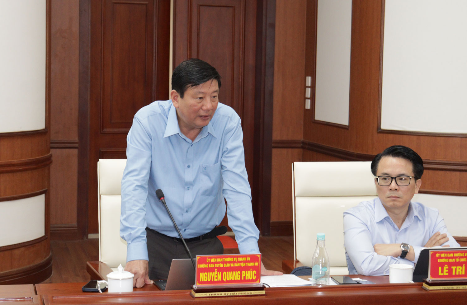 Đồng chí Nguyễn Quang Phúc, Trưởng Ban Tuyên giáo và Dân vận Thành ủy phát biểu tại cuộc họp.
