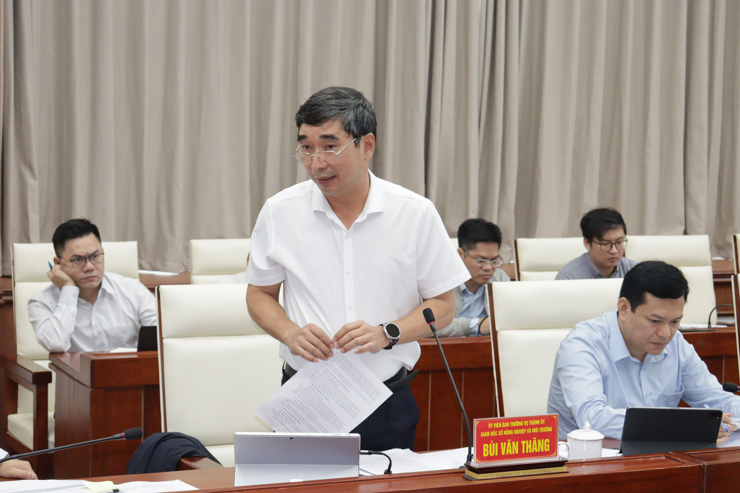 Đồng chí Bùi Văn Thăng, Giám đốc Sở Nông nghiệp và Môi trường phát biểu tại cuộc họp.Về các Dự án hạ tầng chiến lược và dự án động lực, đồng chí Bí thư Thành ủy đề nghị Đảng ủy UBND thành phố chỉ đạo xây dựng đường găng tiến độ của từng dự án, tập trung tháo gỡ những khó khăn vướng mắc đặc biệt là công tác giải phóng mặt bằng, báo cáo Ban Chỉ đạo để theo dõi, đôn đốc kịp thời.