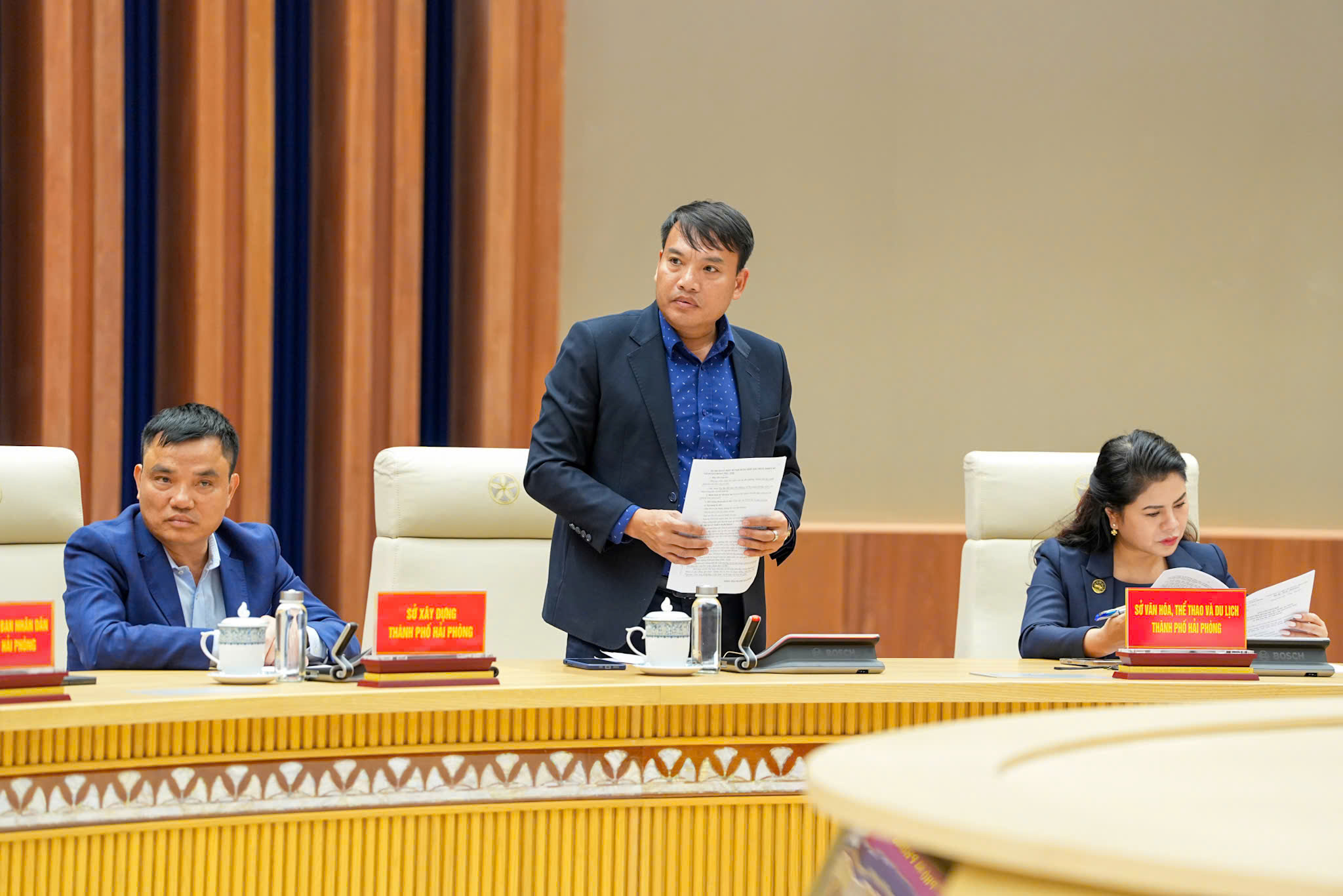 Đồng chí Nguyễn Minh Hùng, Phó Chủ tịch UBND thành phố Hải Phòng phát biểu.Tại cuộc làm việc, các đại biểu thảo luận về Quy chế phối hợp quản lý hoạt động phương tiện thủy nội địa vận chuyển hành khách, khách du lịch trên Vịnh Hạ Long (Quảng Ninh) và Vịnh Lan Hạ (Hải Phòng); Kế hoạch chuẩn bị cho việc công bố chính thức Quần thể di tích và danh thắng Yên Tử - Vĩnh Nghiêm - Côn Sơn, Kiếp Bạc được công nhận là Di sản thế giới; chủ trương liên kết hợp tác phát triển du lịch giai đoạn 2026 - 2030 giữa thành phố Hải Phòng và tỉnh Quảng Ninh.