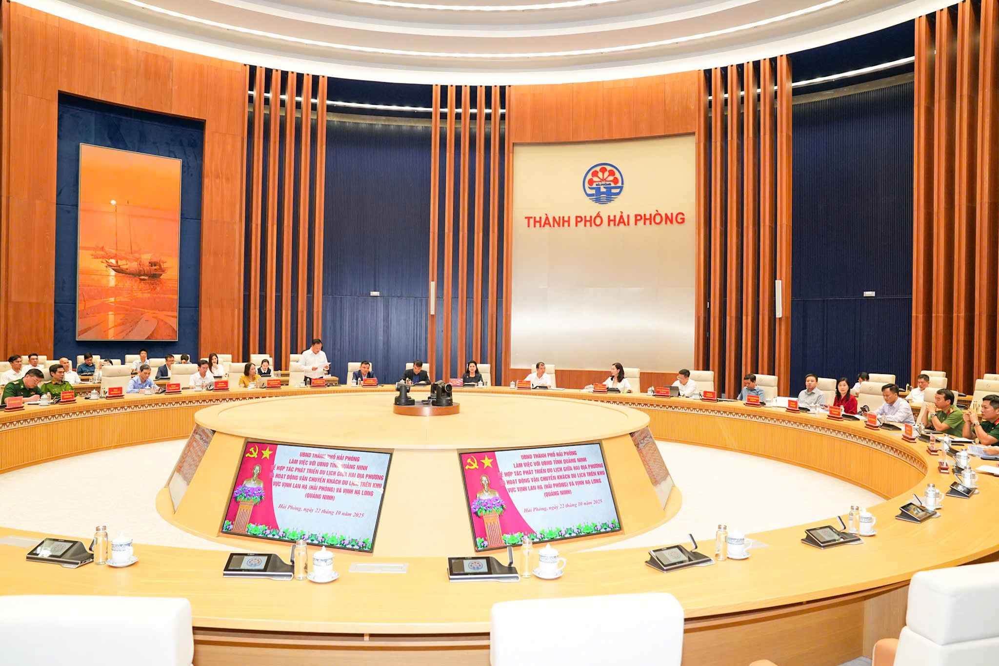 (Haiphong.gov.vn) - Chiều 22/10, tại Trung tâm Hội nghị - Biểu diễn thành phố Hải Phòng, UBND thành phố Hải Phòng tổ chức buổi làm việc với UBND tỉnh Quảng Ninh về hợp tác phát triển du lịch giữa hai địa phương và hoạt động vận chuyển khách du lịch trên khu vực Vịnh Lan Hạ (Hải Phòng) và Vịnh Hạ Long (Quảng Ninh). Các đồng chí: Nguyễn Minh Hùng, Phó Chủ tịch UBND thành phố Hải Phòng; Nguyễn Thị Hạnh, Phó Chủ tịch UBND tỉnh Quảng Ninh đồng chủ trì Hội nghị. Cùng dự có đại diện lãnh đạo các Sở, ngành, địa phương liên quan của 2 tỉnh, thành phố.