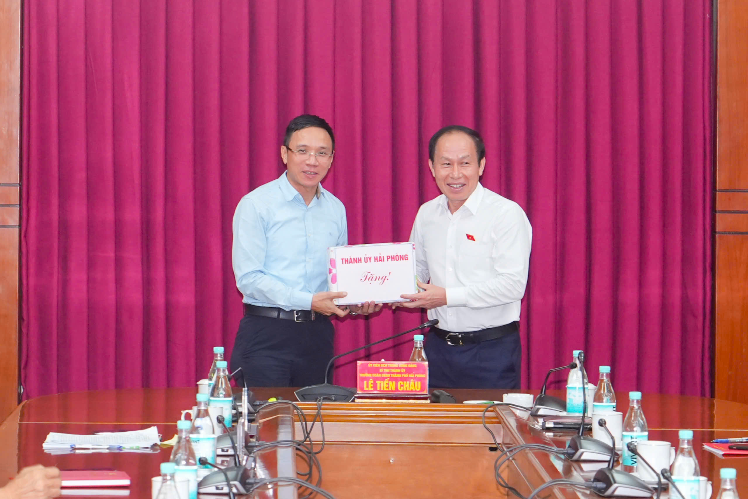 Đồng chí Bí thư Thành ủy Lê Tiến Châu tặng quà cho Đoàn đại biểu thành phố Hải Phòng dự Đại hội đại biểu toàn quốc MTTQ Việt Nam lần thứ X.