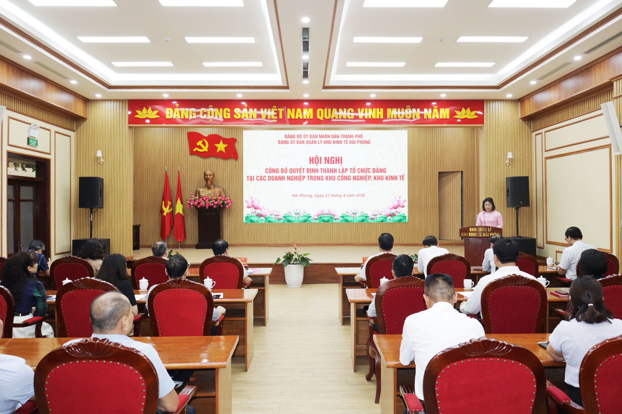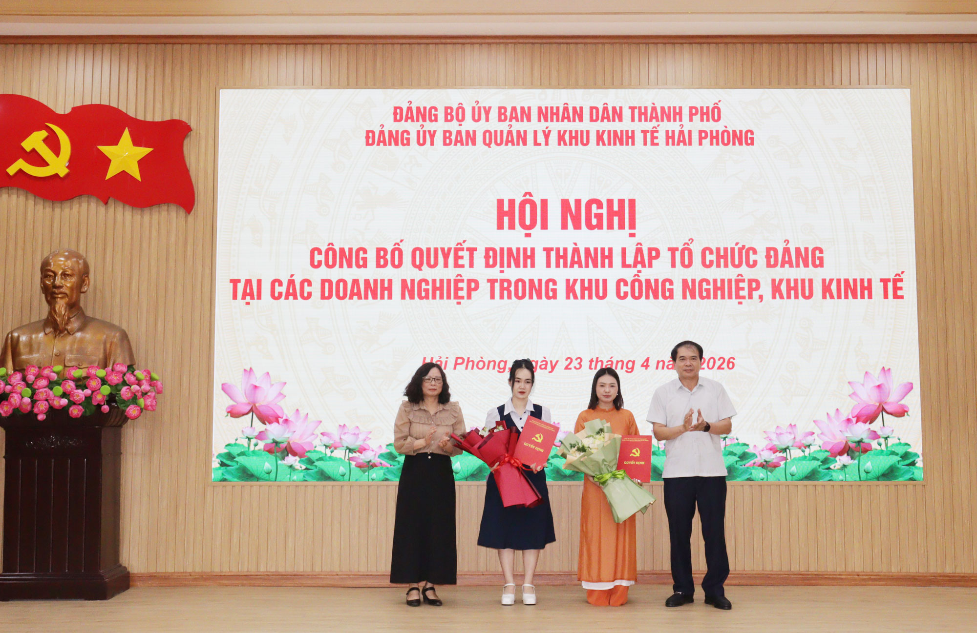 trao Quyết định và tặng hoa cho các Chi bộ.Theo báo cáo của Đảng ủy, 5 tổ chức đảng được công bố thành lập tại hội nghị là những doanh nghiệp đang hoạt động sản xuất tại các Khu công nghiệp trên địa bàn thành phố là Khu công nghiệp Tràng Duệ; Khu công nghiệp VSIP Hải Phòng. Bí thư Chi bộ của các tổ chức đảng được thành lập có trình độ Cao đẳng, Đại học và trên Đại học, là cán bộ công đoàn cơ sở, có 2 đồng chí là Chủ tịch Công đoàn Công ty và giữ vị trí trong Ban Giám đốc doanh nghiệp.