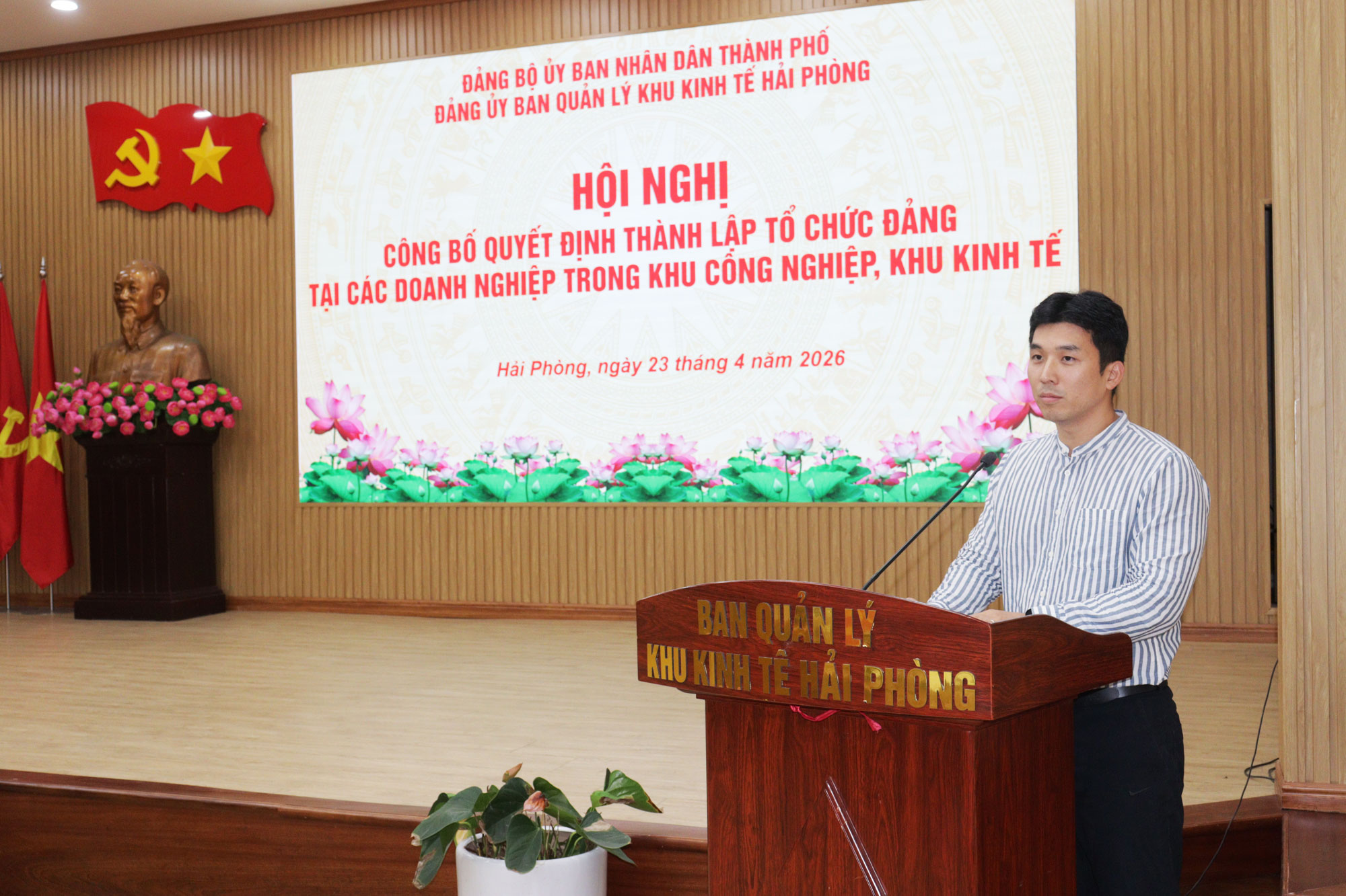 Đại diện lãnh đạo các doanh nghiệp phát biểu tại Hội nghị.Phát biểu tại Hội nghị, đại diện lãnh đạo các doanh nghiệp bày tỏ sự đồng thuận, ủng hộ chủ trương thành lập tổ chức đảng của Đảng ủy Ban Quản lý Khu kinh tế Hải Phòng tại doanh nghiệp. Đồng thời, đánh giá tích cực về vị trí, vai trò của các đồng chí đảng viên trong hoạt động sản xuất kinh doanh của doanh nghiệp và cam kết đồng hành với tổ chức đảng hoạt động trong thời gian tới và đề nghị lãnh đạo Ban Quản lý Khu kinh tế Hải Phòng tiếp tục quan tâm tới hoạt động của nhà đầu tư nước ngoài, hỗ trợ hoạt động của doanh nghiệp.