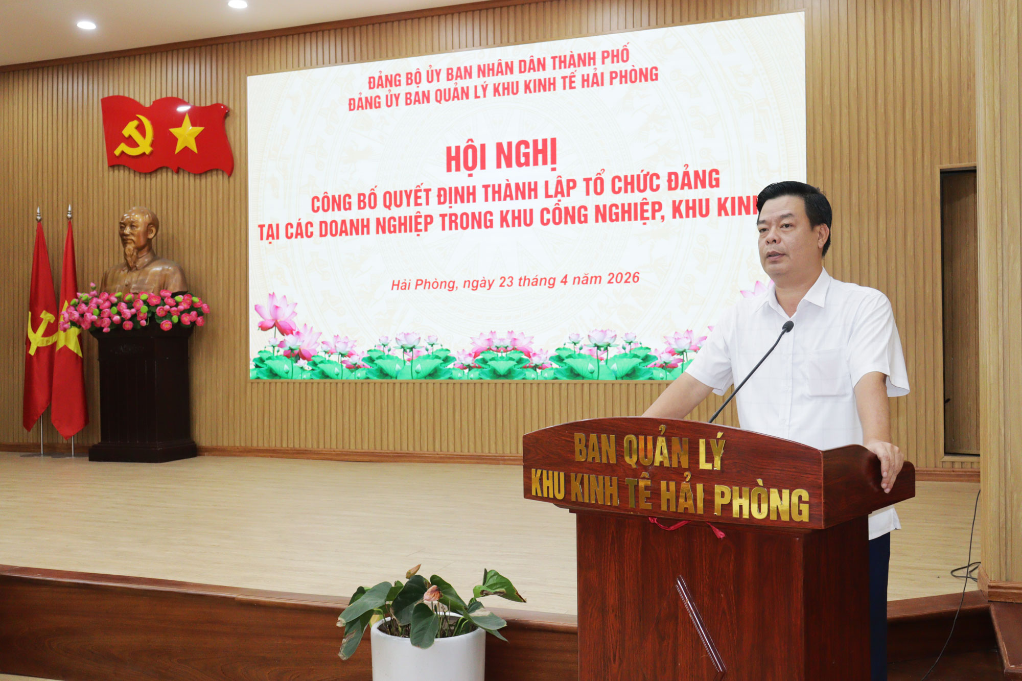 Đồng chí Phạm Văn Thép, Bí thư Đảng ủy, Trưởng Ban Quản lý Khu kinh tế Hải Phòng phát biểu chỉ đạo tại Hội nghị.Phát biểu chỉ đạo tại Hội nghị, đồng chí Phạm Văn Thép, Bí thư Đảng ủy, Trưởng Ban Quản lý Khu kinh tế Hải Phòng chúc mừng 5 tổ chức đảng mới được thành lập tại các doanh nghiệp và cảm ơn sự quan tâm lãnh đạo, chỉ đạo của cấp ủy cấp trên, sự phối hợp chặt chẽ của các cơ quan, đơn vị liên quan; đặc biệt là sự đồng thuận, ủng hộ rất tích cực từ phía các doanh nghiệp.