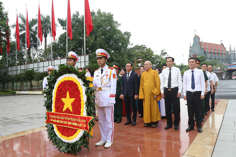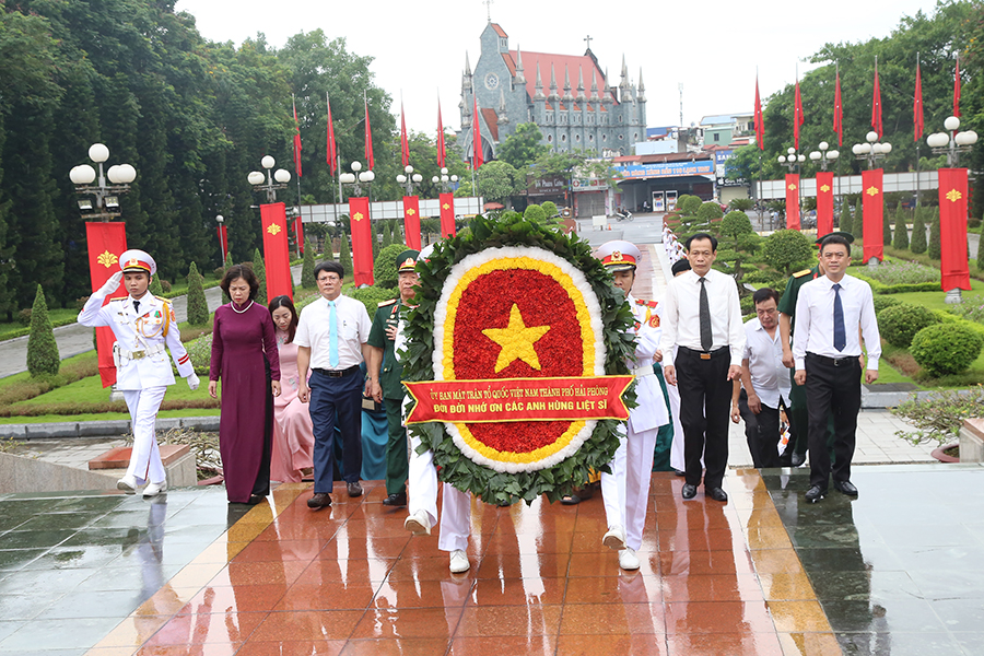 (Haiphong.gov.vn) – Nhân dịp Đại hội đại biểu MTTQ Việt Nam thành phố lần thứ XV (nhiệm kỳ 2024 – 2029), sáng 31/7, Ban Thường trực Ủy ban MTTQ Việt Nam thành phố do đồng chí Đào Trọng Đức, Ủy viên Ban Thường vụ Thành ủy, Chủ tịch Ủy ban MTTQ Việt Nam thành phố làm Trưởng đoàn tổ chức Lễ dâng hương tưởng niệm các Anh hùng liệt sỹ tại Đài tưởng niệm các Anh hùng liệt sỹ thành phố và Tượng đài đồng chí Nguyễn Đức Cảnh trong khuôn viên Cung Văn hóa lao động hữu nghị Việt - Tiệp.