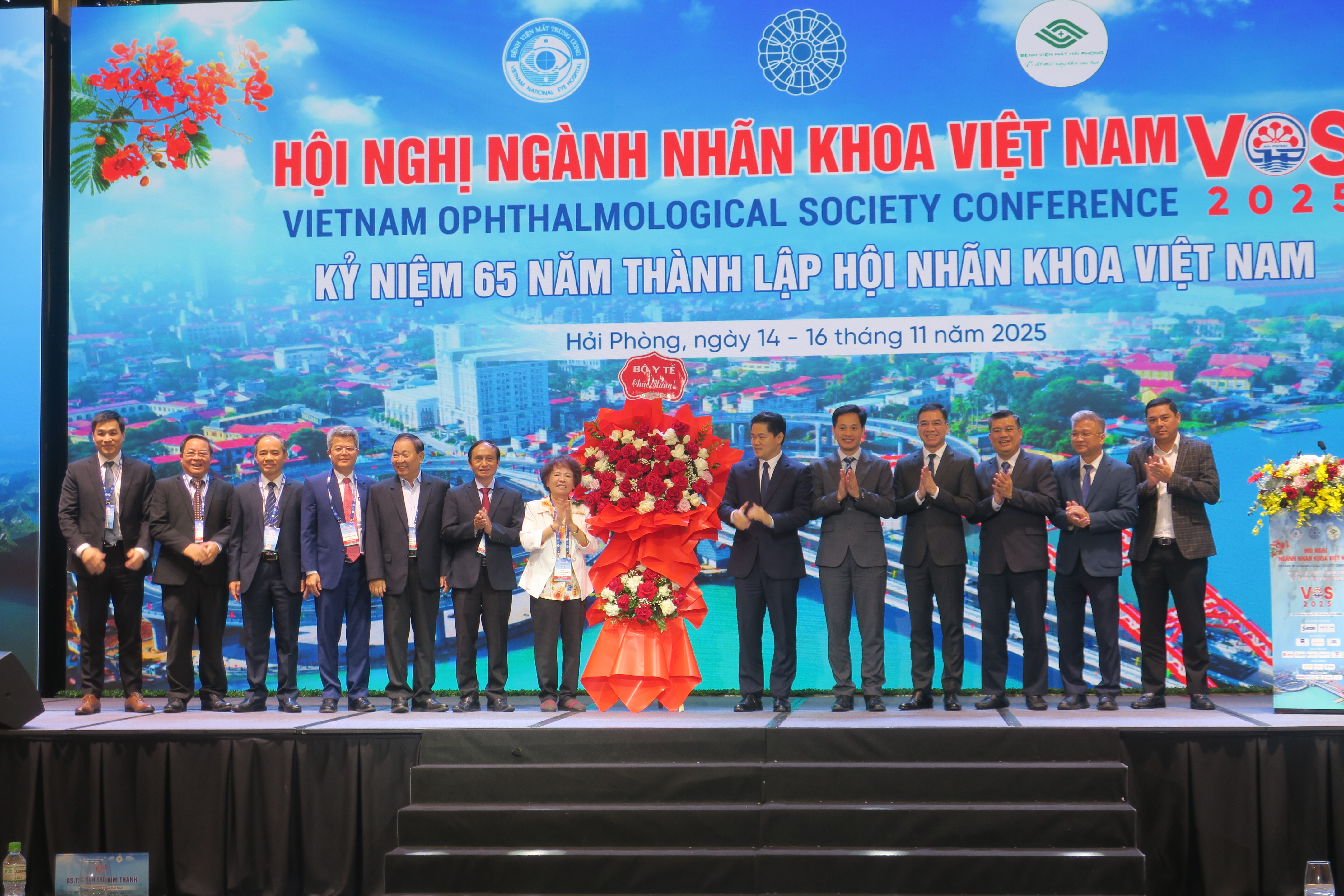 Các đồng chí lãnh đạo tặng hoa chúc mừng Hội nghị.Hội nghị ngành Nhãn khoa Việt Nam là diễn đàn khoa học thường niên lớn nhất của ngành Mắt Việt Nam, thu hút sự tham gia của các chuyên gia, nhà khoa học, bác sỹ nhãn khoa trong và ngoài nước nhằm trao đổi, chia sẻ, công bố những thành tựu nghiên cứu và ứng dụng mới nhất trong lĩnh vực Nhãn khoa.