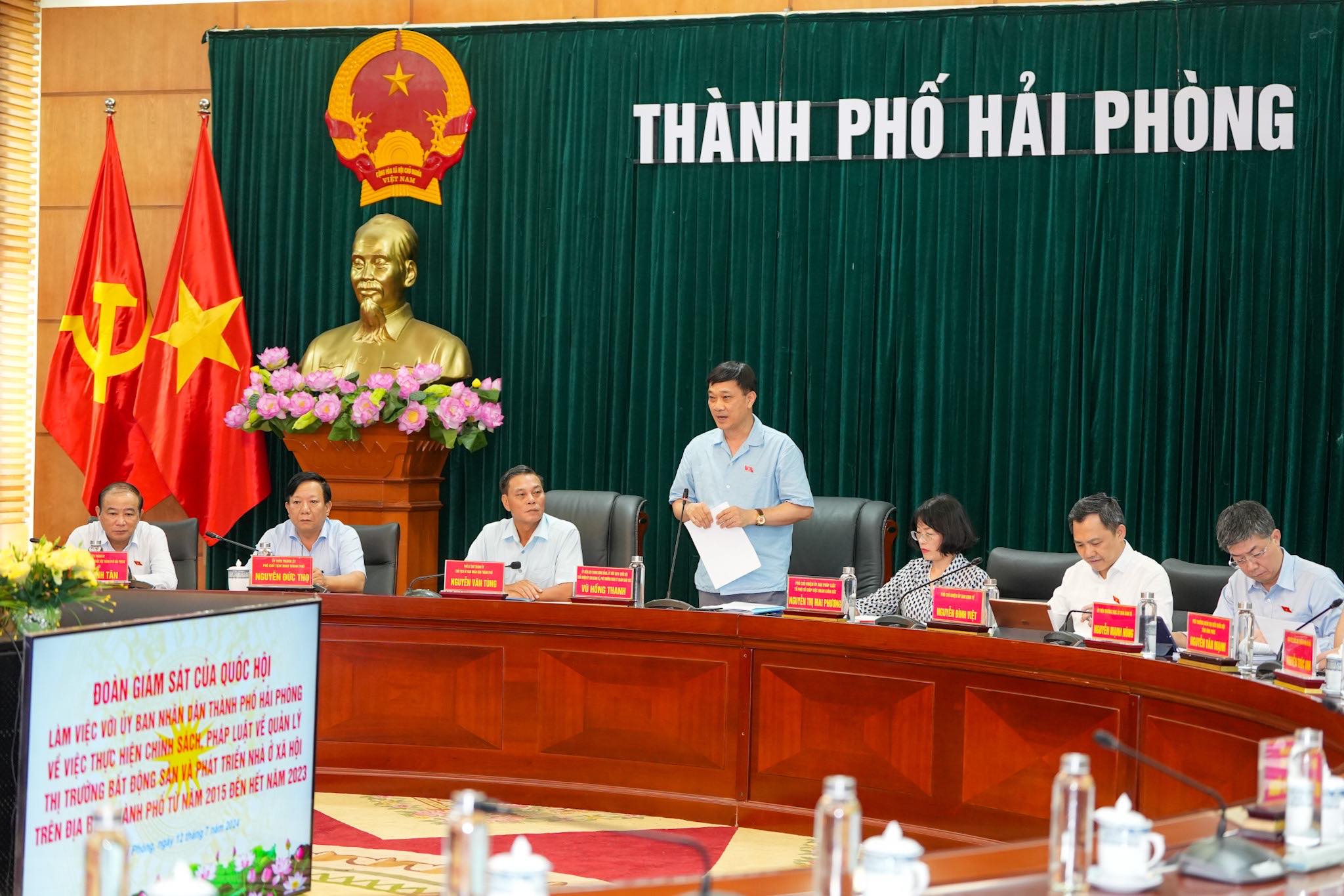 Đồng chí Vũ Hồng Thanh, Chủ nhiệm Ủy ban Kinh tế, Phó Trưởng đoàn Thường trực Đoàn giám sát phát biểu tại cuộc làm việc.Phát biểu tại Hội nghị, đồng chí Vũ Hồng Thanh, Chủ nhiệm Ủy ban Kinh tế, Phó Trưởng đoàn Thường trực Đoàn giám sát đánh giá cao những kết quả thành phố Hải Phòng đã đạt được trong thời gian qua. Đồng thời, yêu cầu thành phố tổng hợp, báo cáo bổ sung thêm kinh nghiệm trong phát triển nhà ở xã hội của địa phương. Từ những khó khăn, vướng mắc, thành phố cần tiếp tục rà soát về mặt thể chế, nhất là với các dự thảo luật sắp ban hành. Các kiến nghị của thành phố sẽ được Đoàn giám sát tiếp thu, xem xét, tổng hợp và báo cáo cụ thể với Quốc hội, từ đó có điều chỉnh nhằm hoàn thiện chính sách và pháp luật, quản lý thị trường bất động sản và phát triển nhà ở xã hội hiệu quả hơn.