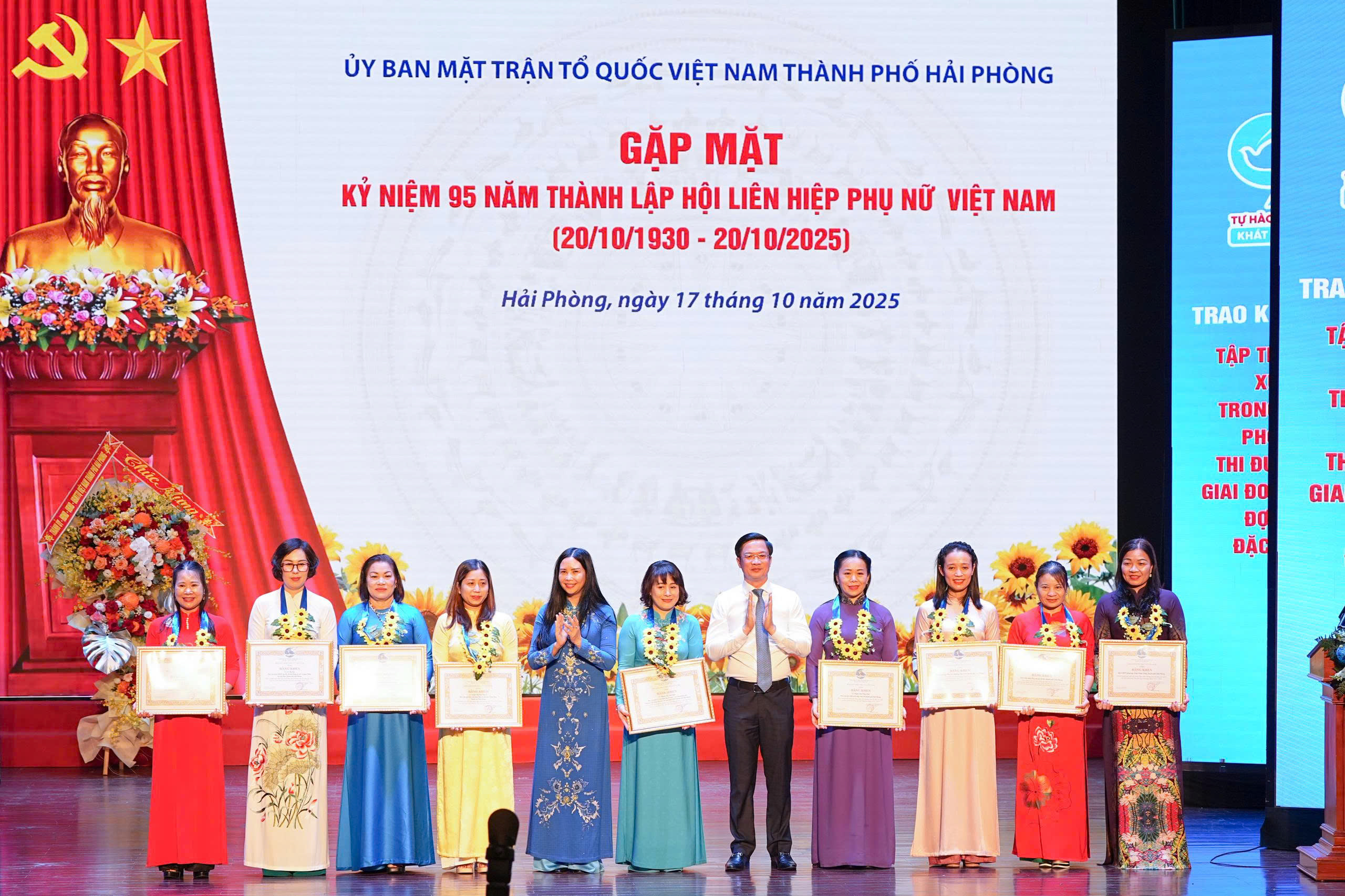 (Haiphong.gov.vn) - Sáng 17/10, tại Nhà hát thành phố, Hội Liên hiệp Phụ nữ thành phố tổ chức Chương trình kỷ niệm 95 năm Ngày thành lập Hội Liên hiệp Phụ nữ Việt Nam (20/10/1930 - 20/10/2025); gặp mặt đại diện cán bộ nữ, cán bộ Hội phụ nữ các cấp và trao giải Cuộc thi tuyên truyền gương điển hình “Đằm thắm hoa đất Cảng”.