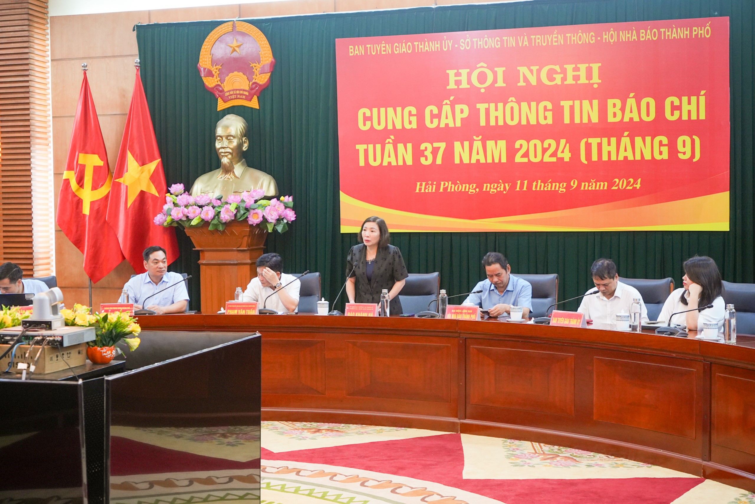 (Haiphong.gov.vn) - Chiều 11/9, Ban Tuyên giáo Thành ủy chủ trì phối hợp với Sở Thông tin và Truyền thông, Hội Nhà báo thành phố tổ chức Hội nghị cung cấp thông tin Báo chí tuần 37 năm 2024. Đồng chí Đào Khánh Hà, Ủy viên Ban Thường vụ, Trưởng ban Ban Tuyên giáo Thành ủy chủ trì Hội nghị.