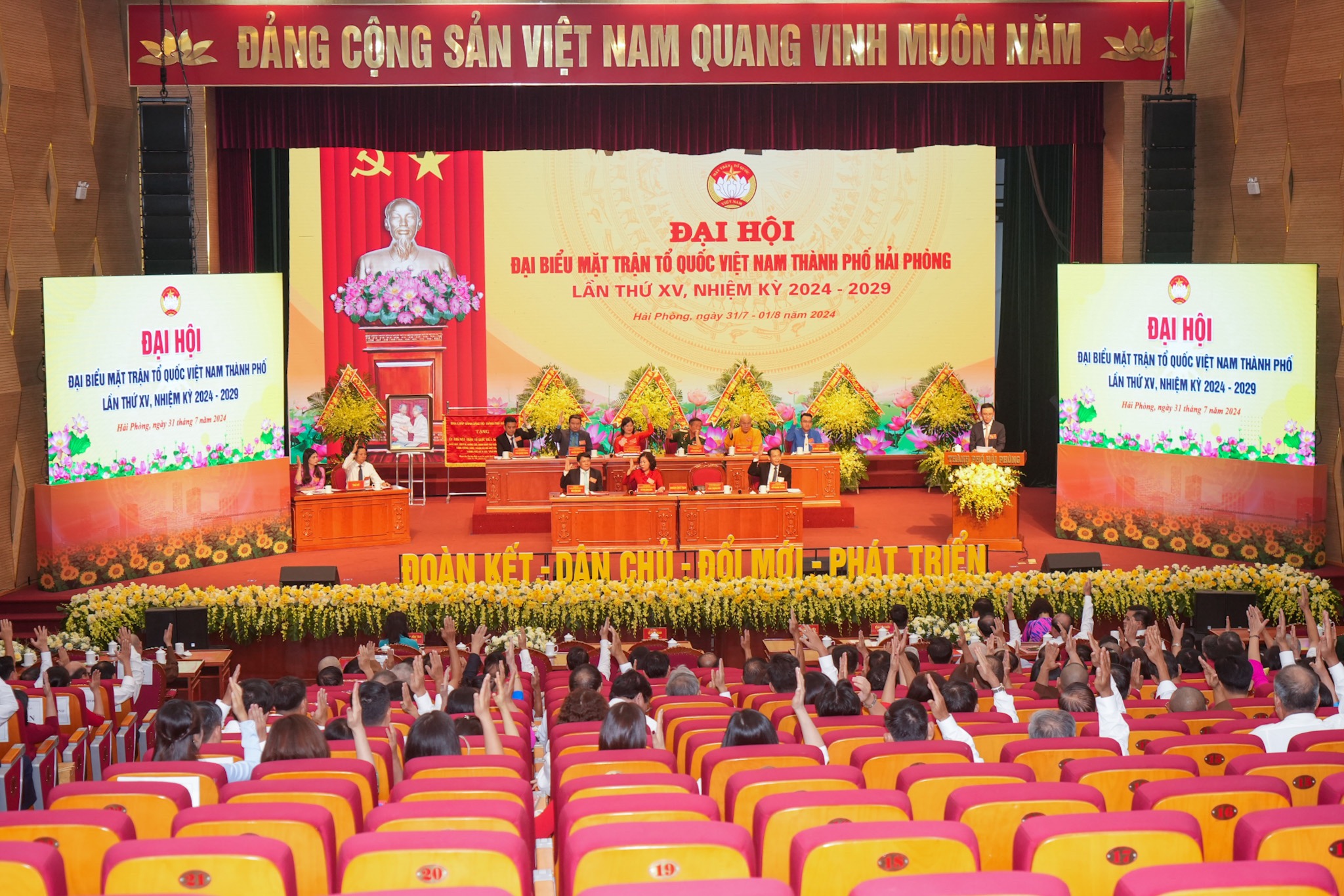 Đoàn Chủ tịch điều hành Đại hội. Với chủ đề “Đoàn kết - dân chủ - đổi mới, phát triển”, Đại hội sẽ diễn ra trong 2 ngày 31/7 và 1/8/2024. Đại hội có nhiệm vụ đánh giá toàn diện tình hình, kết quả thực hiện Nghị quyết Đại hội khóa XIV, nhiệm kỳ 2019-2024, rút ra bài học thực tiễn và đề ra chương trình hành động thiết thực, hiệu quả cho nhiệm kỳ mới. Trong phiên họp thứ nhất, Đại hội đại biểu Mặt trận Tổ quốc Việt Nam thành phố Hải Phòng lần thứ XV, nhiệm kỳ 2024 - 2029 đã tiến hành hiệp thương cử Đoàn Chủ tịch gồm 10 đại biểu và Thư ký Đại hội gồm 2 đại biểu; biểu quyết thông qua chương trình làm việc và nội quy Đại hội. Đồng thời, Đại hội báo cáo tổng hợp ý kiến đóng góp vào Dự thảo Báo cáo chính trị trình Đại hội Đại biểu toàn quốc MTTQ Việt Nam lần thứ X và báo cáo sửa đổi, bổ sung Điều lệ MTTQ Việt Nam khóa IX; Báo cáo chính trị trình Đại hội MTTQ thành phố khóa XV; báo cáo kiểm điểm hoạt động của Ủy ban và Ban Thường trực Ủy ban MTTQVN thành phố khóa XIV, nhiệm kỳ 2019-2024.