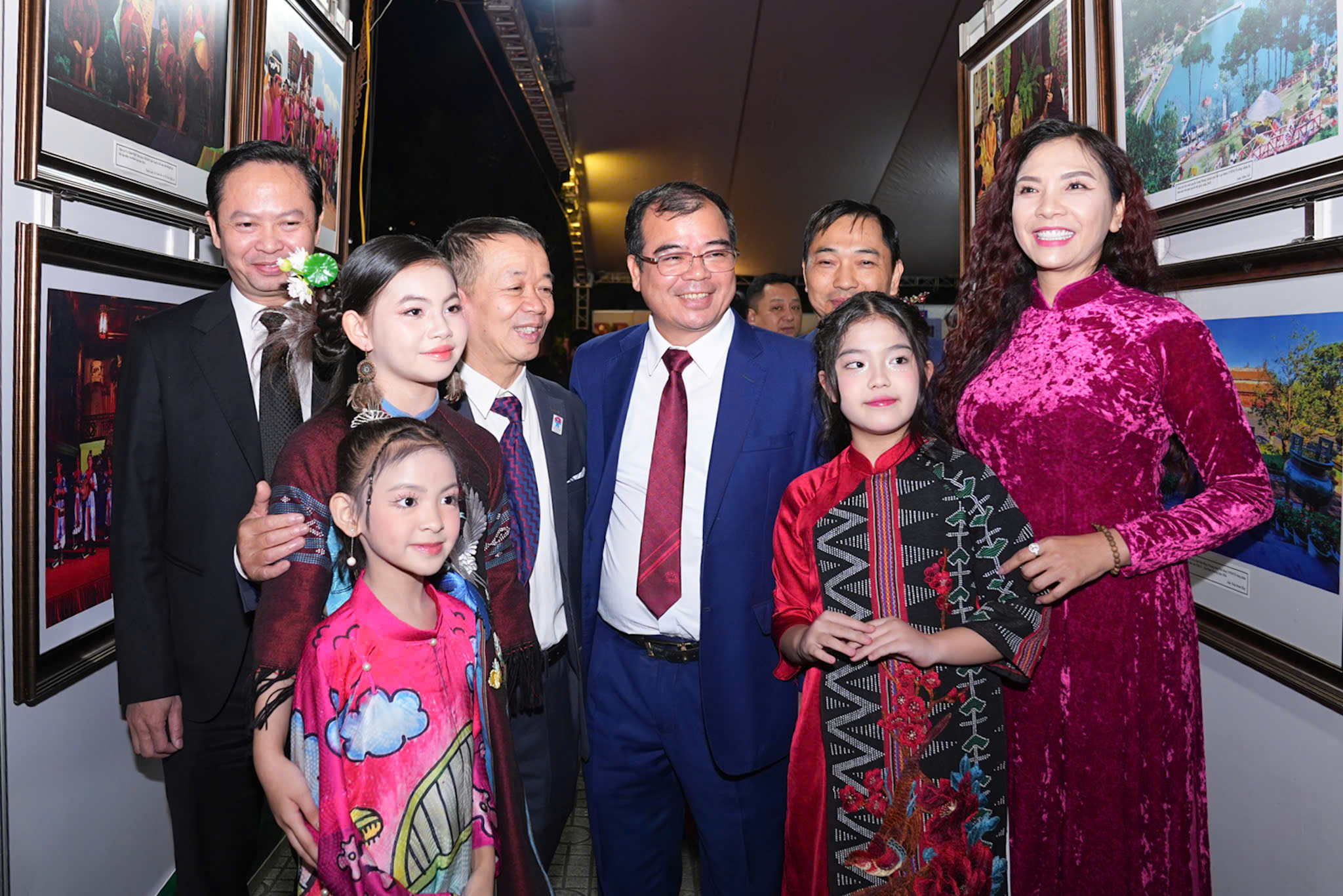 Các đồng chí lãnh đạo tham quan Triển lãm.Triển lãm được tổ chức với không gian trưng bày đa dạng, phong phú, ấn tượng, phản ánh sinh động bức tranh di sản văn hóa, danh thắng và tinh hoa nghề truyền thống Việt Nam. Từ chuyên đề “Sự quan tâm của Chủ tịch Hồ Chí Minh với di sản văn hóa dân tộc”, tôn vinh tình yêu và sự quan tâm sâu sắc của Người đối với sự nghiệp bảo tồn và phát huy văn hóa dân tộc, đến không gian ảnh “Việt Nam – Đất nước cảu miền di sản” giới thiệu các di sản được UNESCO vinh danh, cũng như chuyên đề “Không gian sắc màu di sản văn hóa phi vật thể Việt Nam” với những làn điệu dân ca quan họ, nhã nhạc cung đình Huế, cồng chiêng Tây Nguyên... biểu tượng của sự đa dạng trong thống nhất của văn hóa Việt Nam.