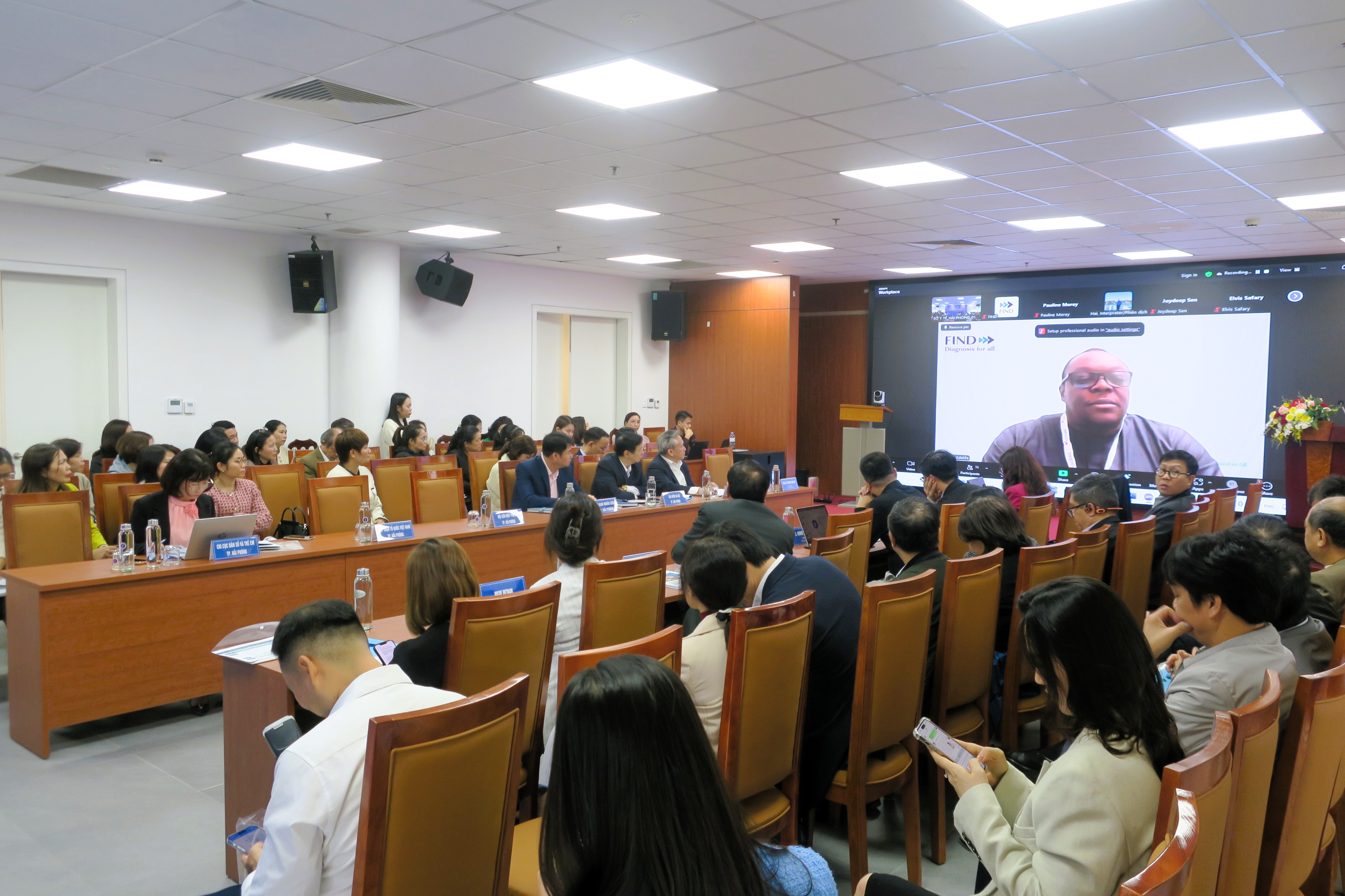 Quang cảnh Hội nghị.Trong giai đoạn 2023 - 2024, FIND đã hỗ trợ thành phố Hải Phòng triển khai thành công mô hình xét nghiệm HPV DNA tại trạm y tế cấp xã để sàng lọc ung thư cổ tử cung góp phần tăng cường khả năng tiếp cận dịch vụ xét nghiệm tại thành phố Hải Phòng. Trong mô hình này, việc thu nhận mẫu phi tập trung với tuỳ chọn phụ nữ tự lấy mẫu đã được thực hiện tại các trạm y tế cấp xã; xét nghiệm tập trung được thực hiện tại phòng xét nghiệm của Trung tâm Kiểm soát bệnh tật (CDC) thành phố Hải Phòng.
