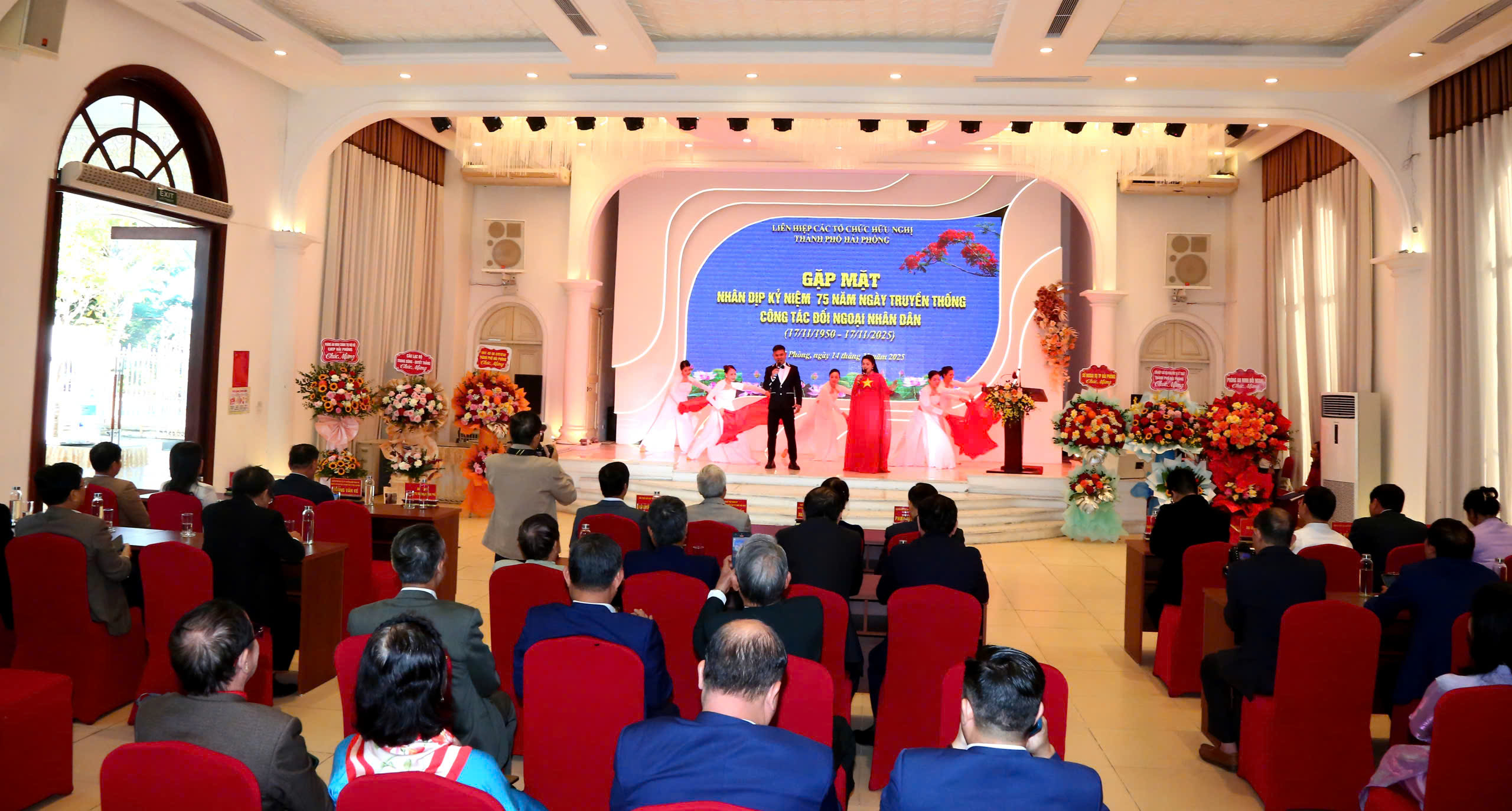 Quang cảnh chương trình.Tại chương trình, các đại biểu đã cùng ôn lại chặng đường 75 năm hình thành và phát triển của công tác đối ngoại nhân dân – một trong ba trụ cột của nền ngoại giao Việt Nam. Qua đó, tri ân những đóng góp quan trọng của các thế hệ cán bộ đã góp phần giữ vững môi trường hòa bình, mở rộng quan hệ hữu nghị, thúc đẩy hợp tác quốc tế phục vụ sự nghiệp xây dựng và bảo vệ Tổ quốc.