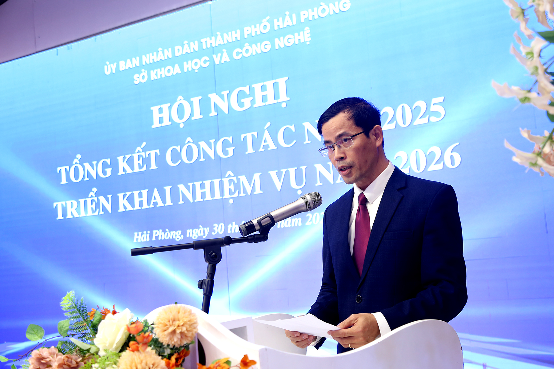 Giám đốc Sở Khoa học và Công nghệ thành phố Nguyễn Cao Thắng phát biểu tại Hội nghị.Phát biểu tại Hội nghị, Giám đốc Sở Khoa học và Công nghệ Nguyễn Cao Thắng nhấn mạnh, năm 2025, Sở đã chủ động, quyết liệt, đổi mới trong tham mưu và tổ chức thực hiện, đạt nhiều kết quả toàn diện trên các lĩnh vực khoa học, công nghệ và đổi mới sáng tạo, góp phần đưa Hải Phòng vươn lên nhóm dẫn đầu cả nước về Chỉ số chuyển đổi số và Chỉ số đổi mới sáng tạo.
