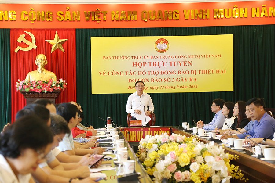 (Haiphong.gov.vn) – Chiều 23/9, Ban Thường trực Ủy ban Trung ương Mặt trận Tổ quốc Việt Nam họp trực tuyến về công tác hỗ trợ đồng bào bị thiệt hại do Bão số 3 gây ra dưới sự chủ trì của đồng chí Đỗ Văn Chiến, Ủy viên Bộ Chính trị, Bí thư Trung ương Đảng, Chủ tịch Ủy ban Trung ương MTTQ Việt Nam.