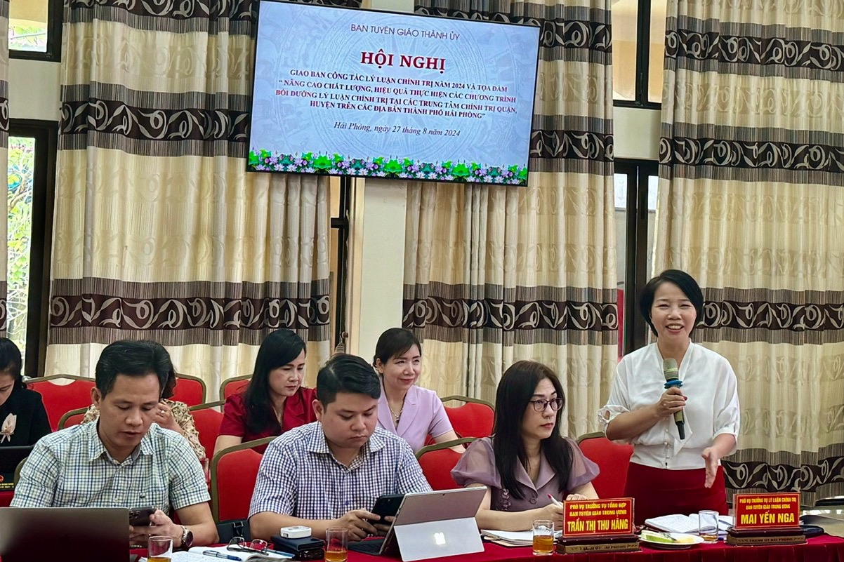 (Haiphong.gov,vn) - Sáng 27/8, tại Hội trường các Ban Xây dựng đảng, Ban Tuyên giáo Thành ủy tổ chức Hội nghị giao ban công tác lý luận chính trị năm 2024 và Tọa đàm “Nâng cao chất lượng, hiệu quả thực hiện các chương trình bồi dưỡng lý luận chính trị tại các Trung tâm chính trị quận, huyện trên địa bàn thành phố”. Đồng chí Đào Khánh Hà, Ủy viên Ban Thường vụ - Trưởng Ban Tuyên giáo Thành ủy chủ trì Hội nghị.