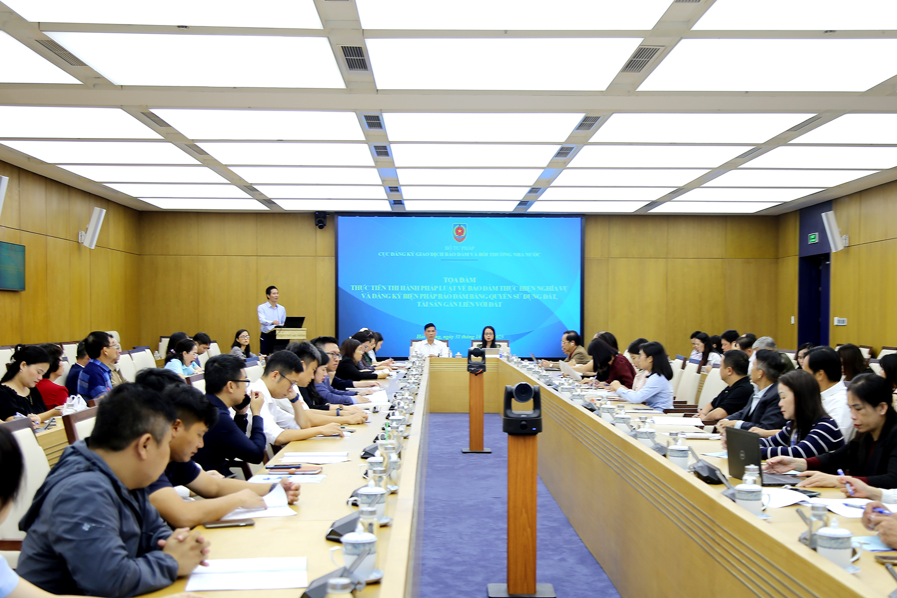 Quang cảnh Tọa đàm. Phó Cục Trưởng Cục Đăng ký giao dịch đảm bảo và Bồi thường nhà nước Văn Thị Khanh Thư phát biểu khai mạc Tọa đàm.