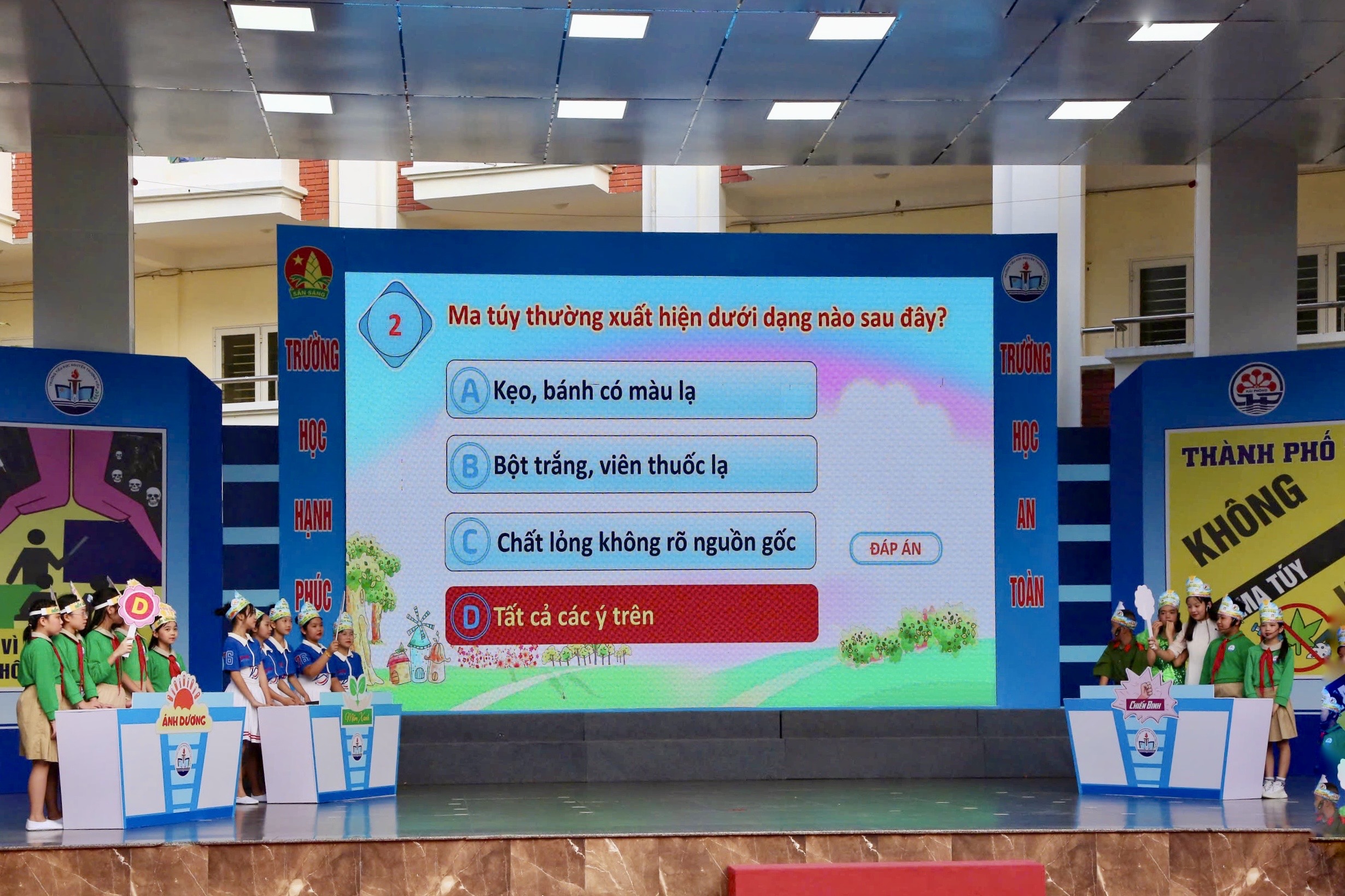 (Haiphong.gov.vn) – Chiều 24/12, Liên đội trường Tiểu học Nguyễn Thượng Hiền, phường Ngô Quyền tổ chức chuyên đề Đội cấp thành phố “Thành phố không ma túy – Trường học an toàn”. Chuyên đề được cụ thể hóa qua 3 phần thi sôi nổi nhằm trang bị kiến thức và kỹ năng phòng chống ma túy cho học sinh.