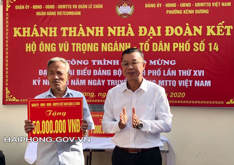 (Haiphong.gov.vn) - Sáng 8/10, Ủy ban MTTQ Việt Nam phường Kênh Dương, quận Lê Chân tổ chức khánh thành nhà “Đại đoàn kết" hộ ông Vũ Trọng Ngánh, tại Tổ dân phố số 14. Đây là một trong những hoạt động thiết thực chào mừng Đại hội Đảng thành phố lần thứ XVI, tiến tới Đại hội đại biểu toàn quốc lần thứ XIII, (nhiệm kỳ 2020 - 2025); kỷ niệm 90 năm ngày truyền thống MTTQ Việt Nam (18/11/1930 - 18/11/2020).