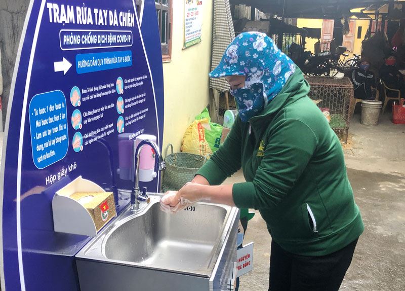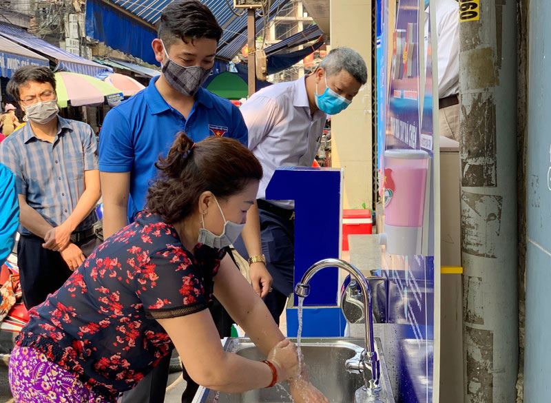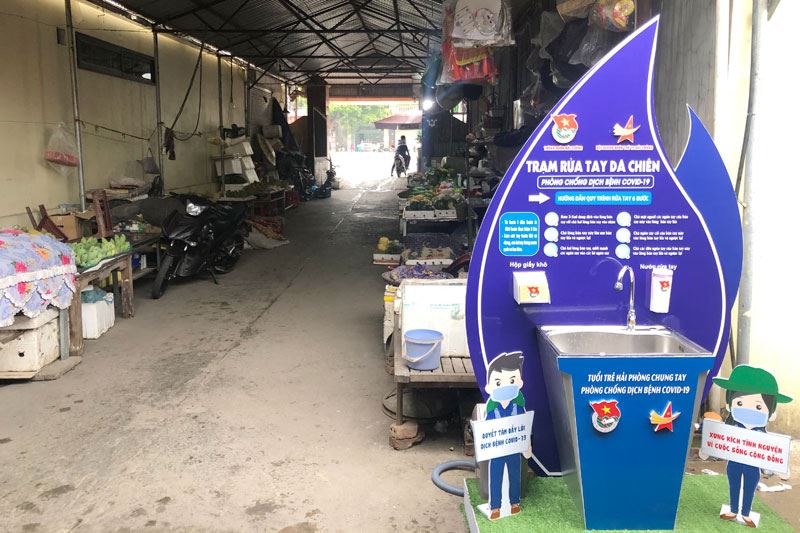 Trạm rửa tay dã chiến được đặt tại chợ Cố Đạo, quận Ngô Quyền