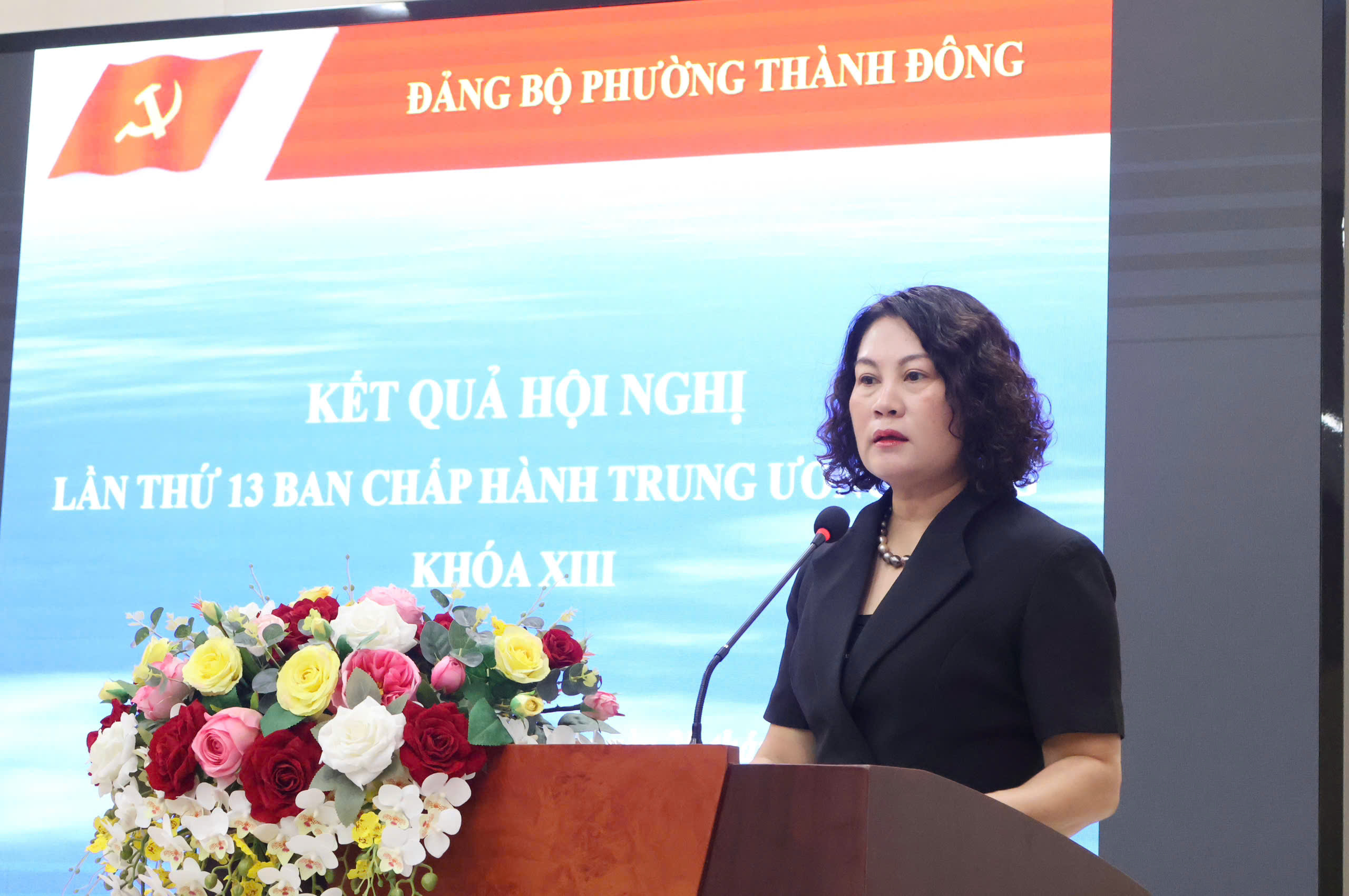 Đồng chí Ngô Thị Thanh Hòa, Thành ủy viên, Bí thư Đảng ủy, Chủ tịch HĐND phường Thành Đông quán triệt nội dung của hội nghịBan Chấp hành Đảng bộ phường thống nhất thông qua các nghị quyết “Xây dựng phường trở thành phường không ma túy”; nghị quyết nâng cao chất lượng, hiệu quả công tác kiểm tra, giám sát và thi hành kỷ luật Đảng giai đoạn 2026 – 2030; và kết quả cuộc giám sát của Ban Chấp hành Đảng bộ phường.