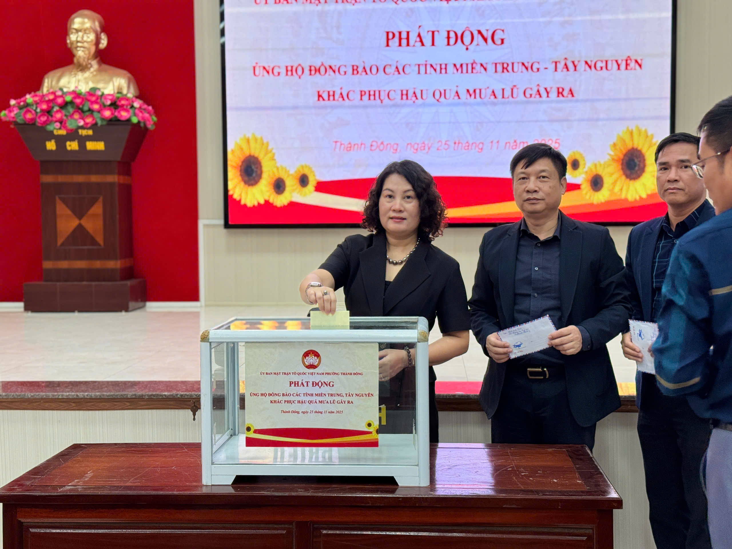 Lãnh đạo phường Thành Đông quyên góp ủng hộ đồng bào miền Trung - Tây Nguyên khắc phục hậu quả bão lũTại hội nghị, Ban Chấp hành Đảng bộ phường đã quyên góp ủng hộ đồng bào miền Trung, Tây Nguyên đang gặp khó khăn do mưa lũ. Cùng với đó, Ủy ban MTTQ Việt Nam phường Thành Đông chính thức phát động cán bộ, đảng viên, công chức, viên chức và nhân dân toàn phường tham gia ủng hộ, chung tay hỗ trợ các tỉnh miền Trung – Tây Nguyên khắc phục hậu quả thiên tai.