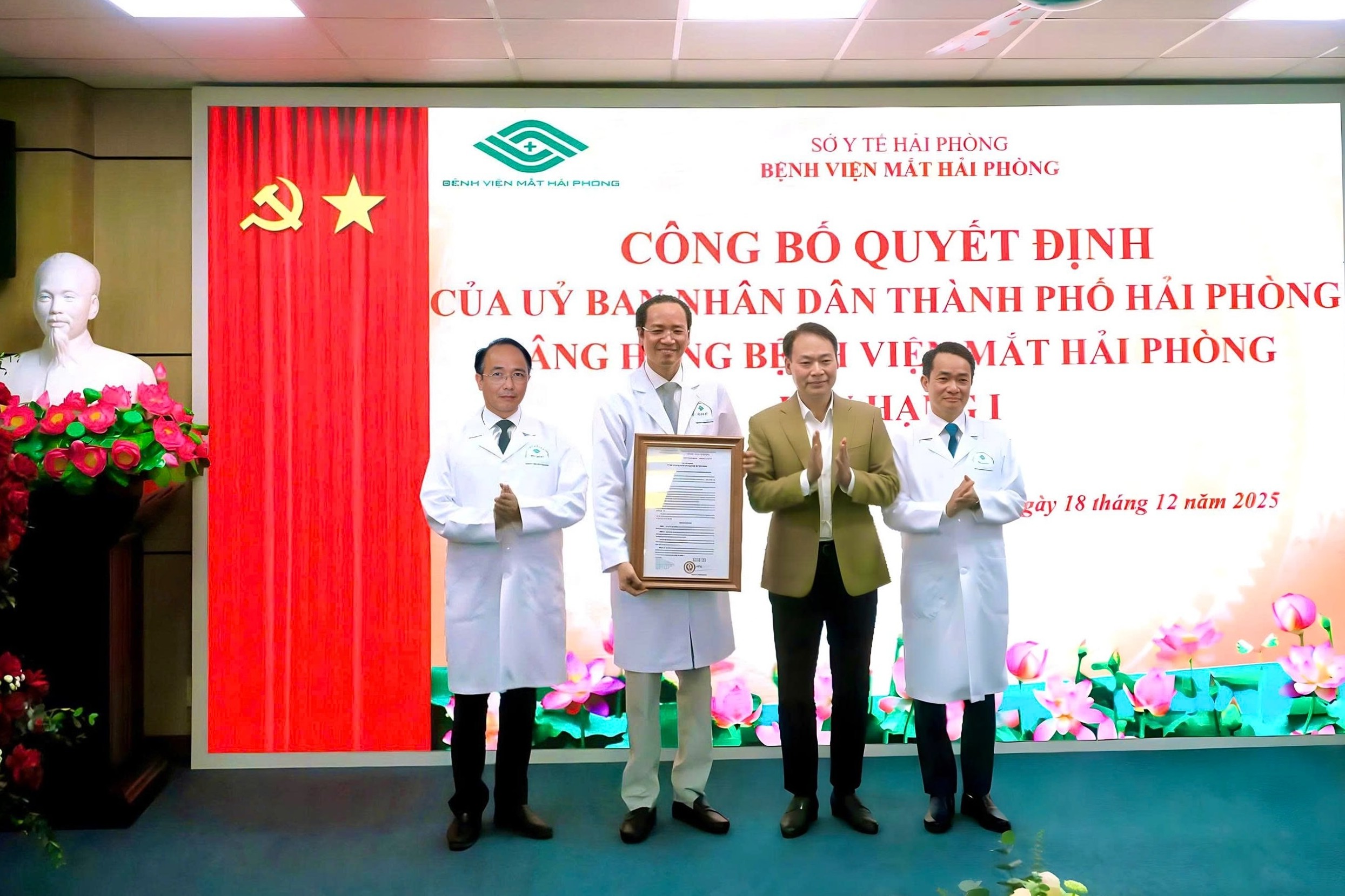Các đồng chí lãnh đạo trao Quyết định công nhận bệnh viện chuyên khoa hạng I cho Bệnh viện Mắt Hải Phòng.Đặc biệt, tháng 12/2025, Bệnh viện Mắt Hải Phòng chính thức được công nhận là bệnh viện chuyên khoa hạng I. Đây là dấu mốc quan trọng, ghi nhận những nỗ lực vượt bậc của tập thể bệnh viện trong công tác quản trị, nâng cao năng lực chuyên môn, chuẩn hóa quy trình khám chữa bệnh, hiện đại hóa cơ sở vật chất và trang thiết bị chuyên sâu. Việc được nâng hạng không chỉ khẳng định uy tín, vị thế của Bệnh viện Mắt Hải Phòng mà còn góp phần nâng cao chất lượng dịch vụ y tế, đáp ứng ngày càng tốt hơn nhu cầu chăm sóc sức khỏe Nhân dân, đóng góp tích cực vào sự phát triển của ngành Y tế thành phố trong giai đoạn mới.