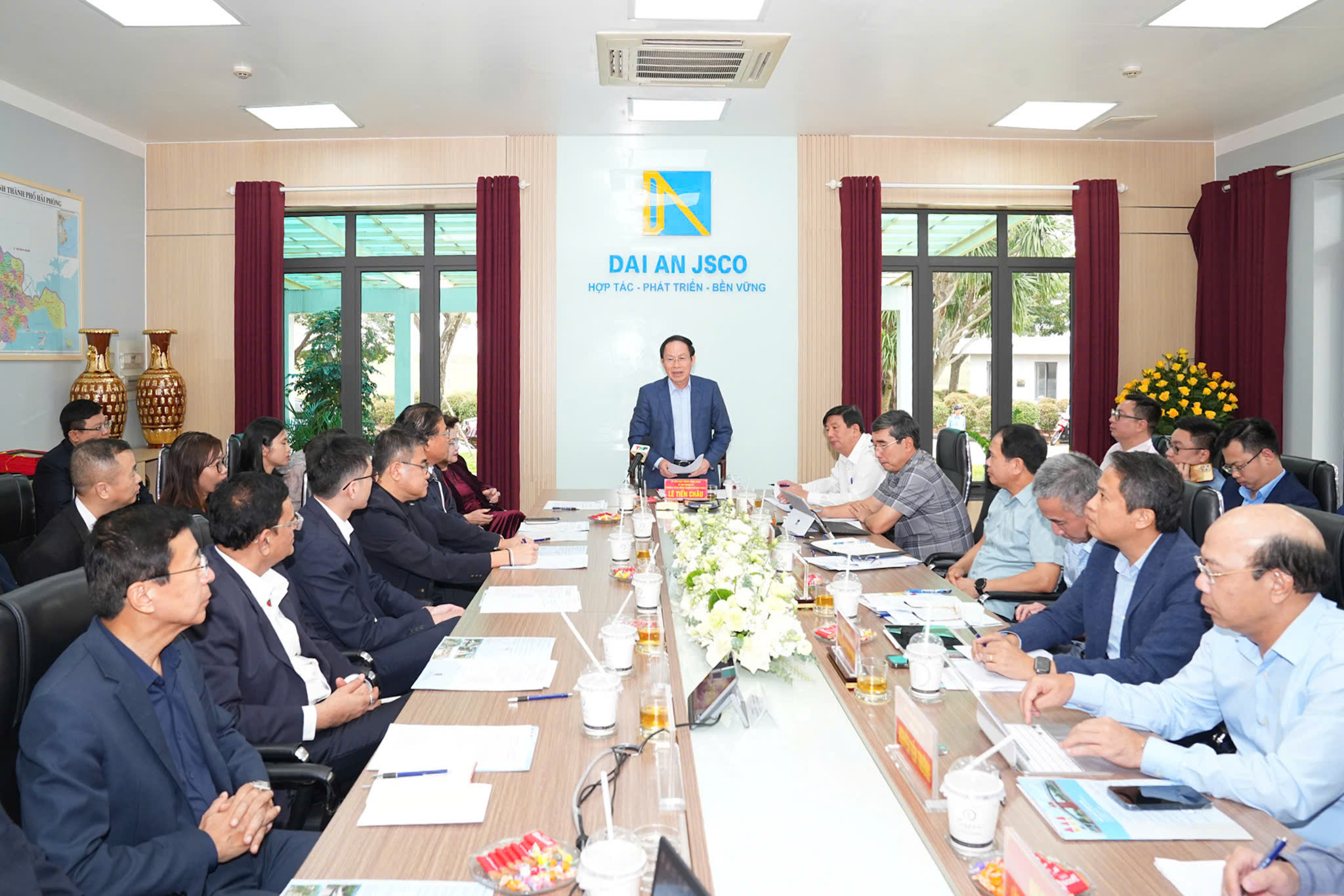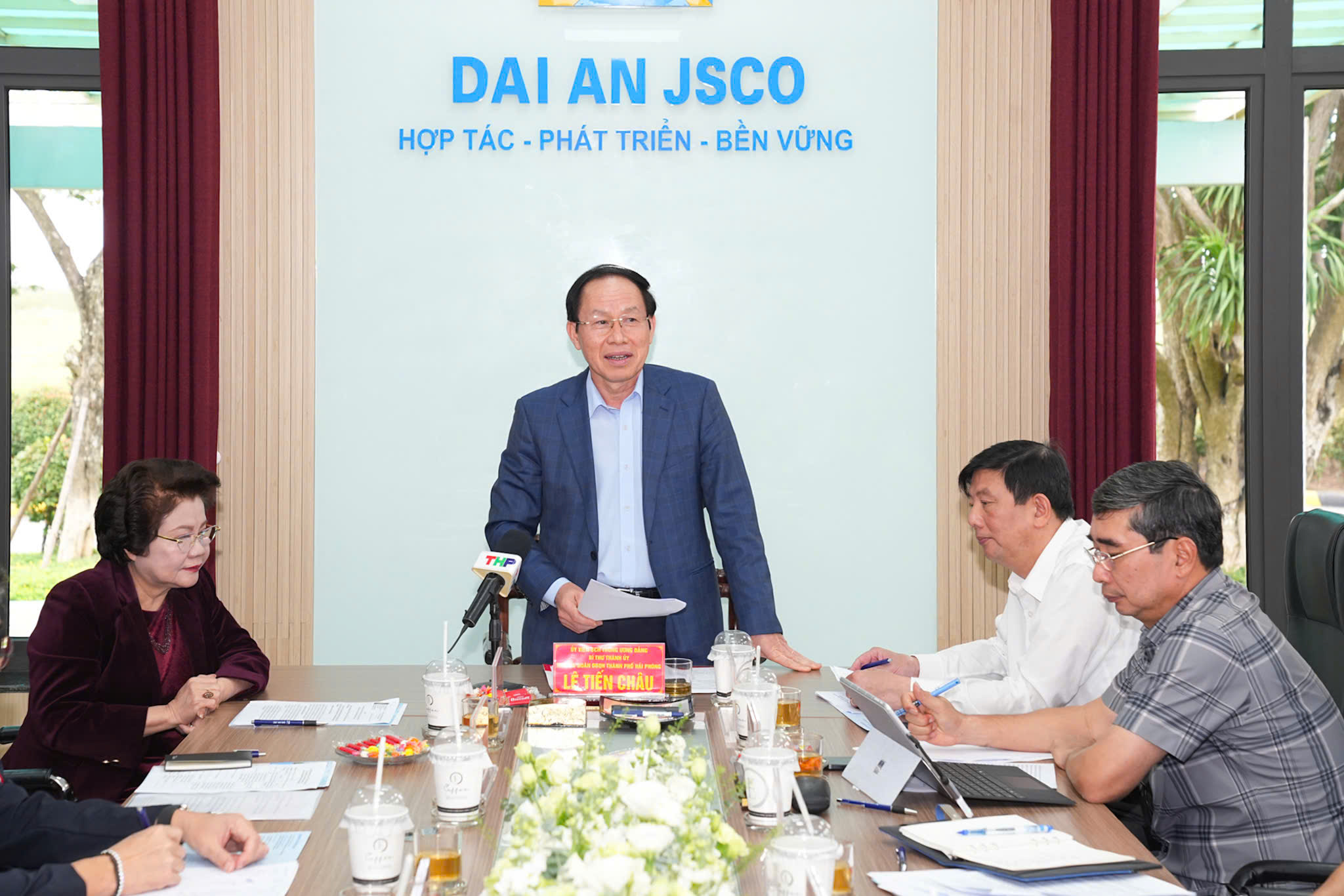Phát biểu tại buổi làm việc, đồng chí Bí thư Thành ủy Lê Tiến Châu ghi nhận và cảm ơn những đóng góp của Công ty Cổ phần Đại An và các doanh nghiệp tại Khu công nghiệp Đại An đối với sự phát triển chung của tỉnh Hải Dương trước đây và nay là thành phố Hải Phòng.