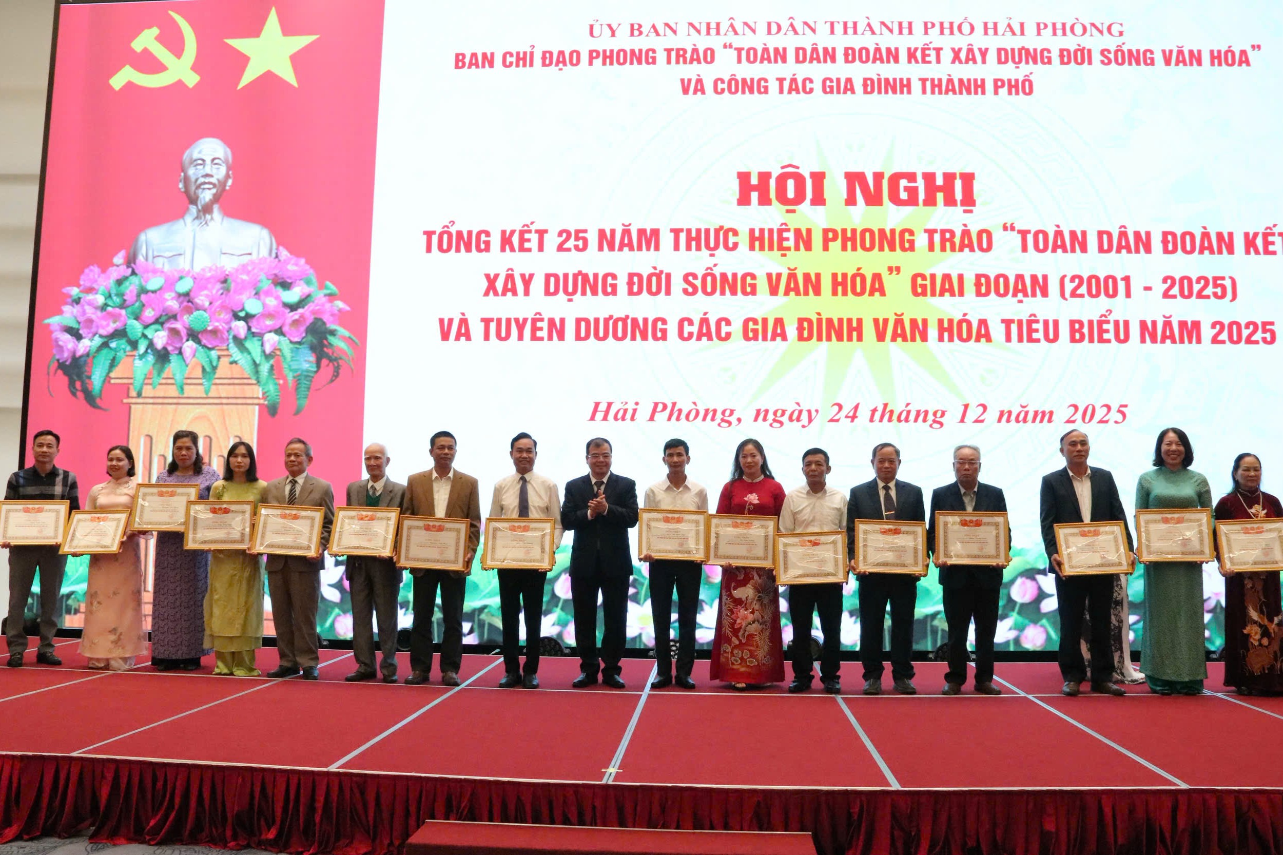 Đại diện các gia đình được biểu dương tại Hội nghị.Phó Chủ tịch nhấn mạnh, trong bối cảnh thành phố Hải Phòng bước vào giai đoạn phát triển mới, Phong trào “Toàn dân đoàn kết xây dựng đời sống văn hóa” cần được nâng tầm rõ rệt, không chỉ là phong trào vận động quần chúng, mà phải trở thành nhiệm vụ chính trị - xã hội quan trọng, trực tiếp góp phần xây dựng con người.