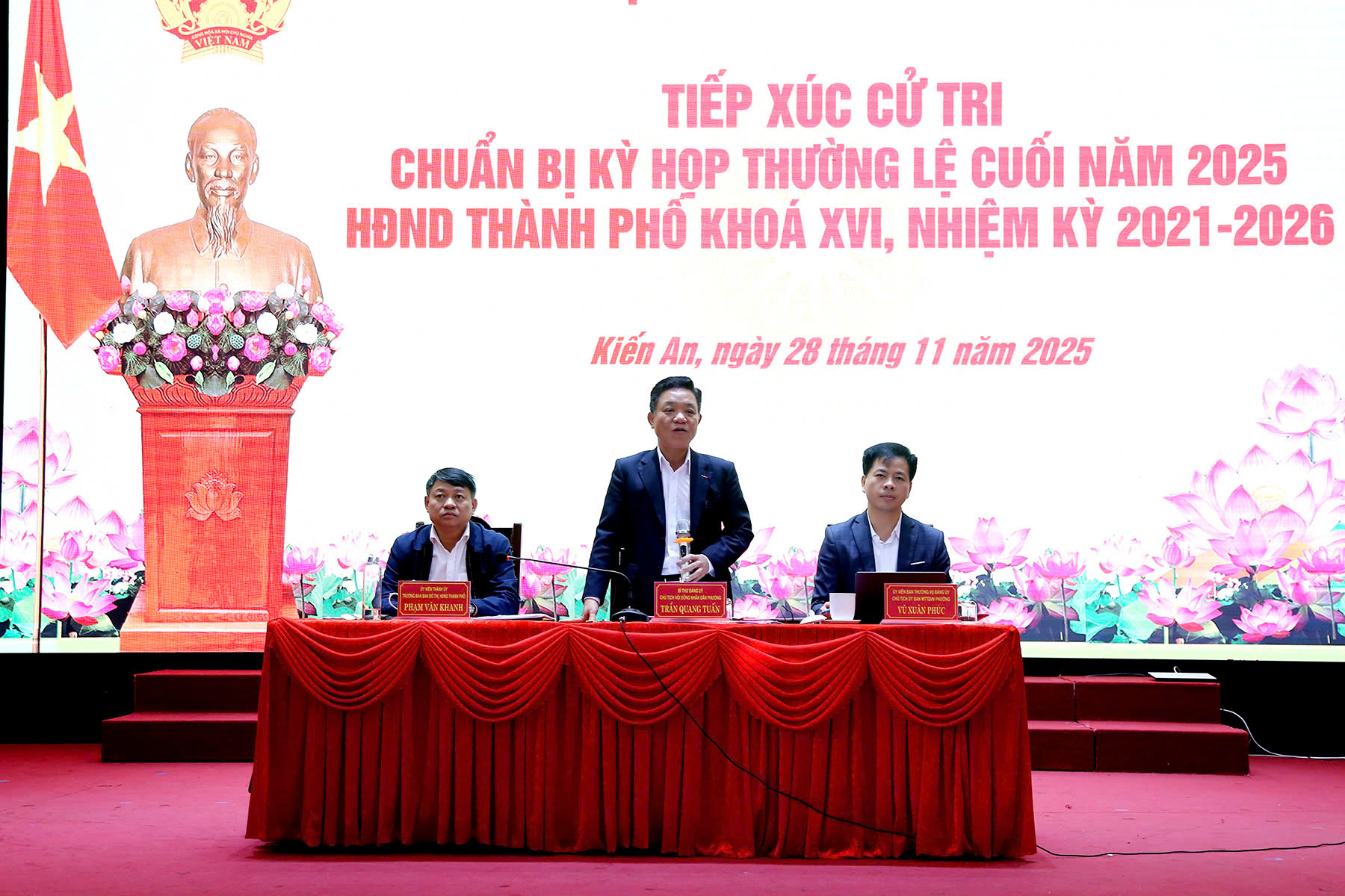 Đại biểu chủ trì tiếp xúc cử tri tại phường Kiến AnCụ thể, cử tri phường An Phong đề nghị UBND thành phố và các sở ngành quan tâm, xem xét cho đầu tư xây dựng thêm một phân hiệu của Trường THPT An Dương trên địa bàn phường để đáp ứng nhu cầu học tập. Cử tri phường An Hải đề nghị HĐND thành phố cần giám sát kỹ quy trình tuyển chọn đãi ngộ học sinh giỏi, giáo viên giỏi để bảo đảm sự công bằng, minh bạch, tránh lãng phí ngân sách và thực sự chọn được người tài. Đề nghị thành phố cần rà soát kỹ đối tượng thụ hưởng việc hỗ trợ đóng bảo hiểm y tế cho các nhóm đối tượng xã hội, đơn giản hóa thủ tục hành chính để người dân dễ dàng tiếp cận chính sách này. Đề nghị việc đặt tên đường phố cần ưu tiên các tên gọi gắn liền với lịch sử, văn hóa địa phương để giáo dục truyền thống cho thế hệ trẻ.