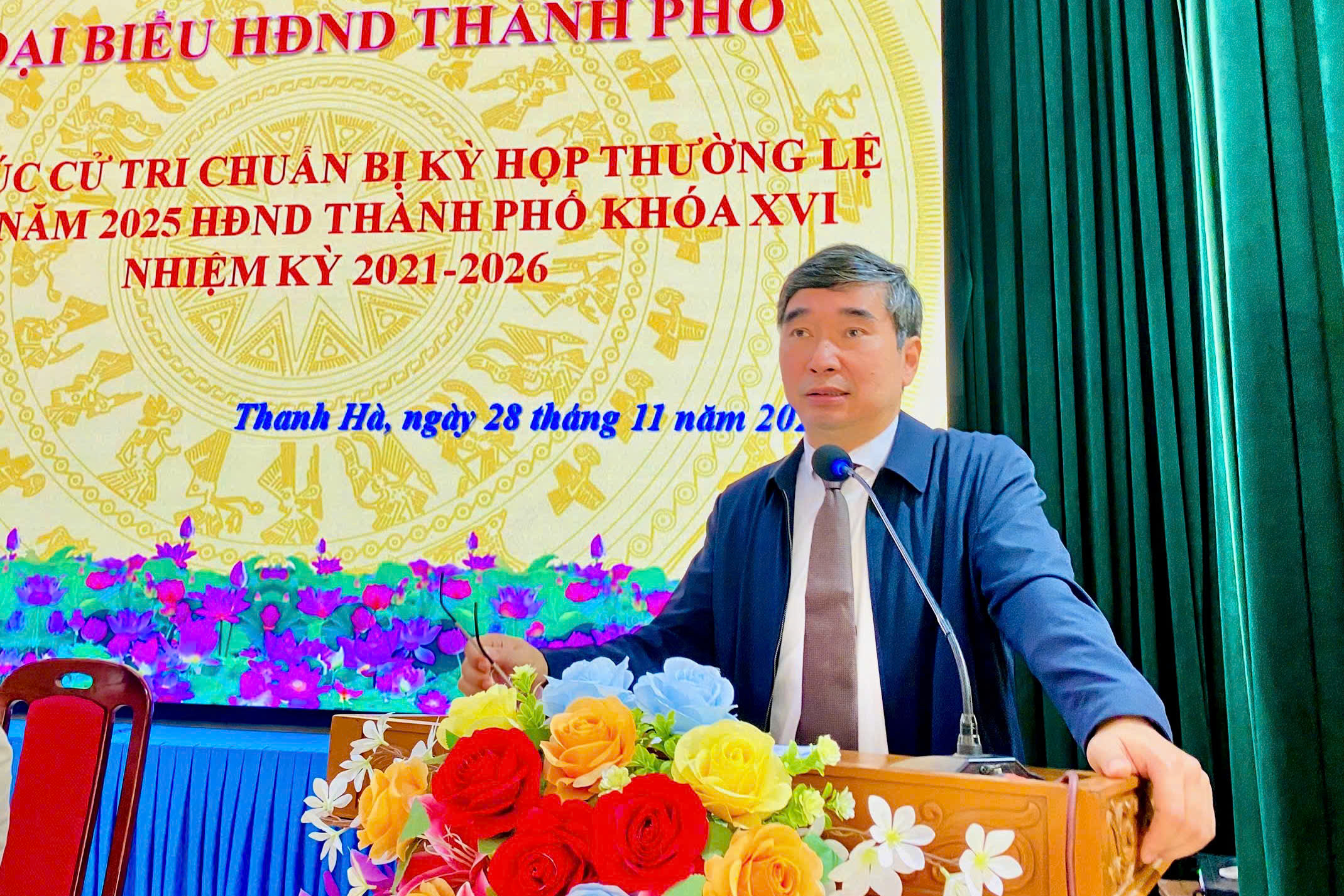 Đồng chí Lê Văn Hiệu, Phó Bí thư Thành ủy, Chủ tịch HĐND thành phố phát biểu tại buổi tiếp xúc.Với tinh thần trách nhiệm và cầu thị, các đồng chí lãnh đạo thành phố đã ghi nhận và đánh giá cao tinh thần trách nhiệm của cử tri các địa phường, đồng thời nhấn mạnh, những ý kiến, kiến nghị mà cử tri nêu đều là những vấn đề sát thực tiễn, liên quan trực tiếp đến đời sống của nhân dân, nhất là lĩnh vực hạ tầng giao thông, điện chiếu sáng, giáo dục và môi trường. Các đồng chí lãnh đạo thành phố đề nghị chính quyền các xã tiếp tục làm tốt vai trò cầu nối, thường xuyên nắm bắt tâm tư, nguyện vọng của nhân dân, chủ động tham mưu, đề xuất với thành phố những vấn đề cấp thiết. Các cơ quan chuyên môn cần tăng cường kiểm tra, đôn đốc tiến độ các dự án hạ tầng dân sinh, đảm bảo chất lượng, hiệu quả, tránh kéo dài.