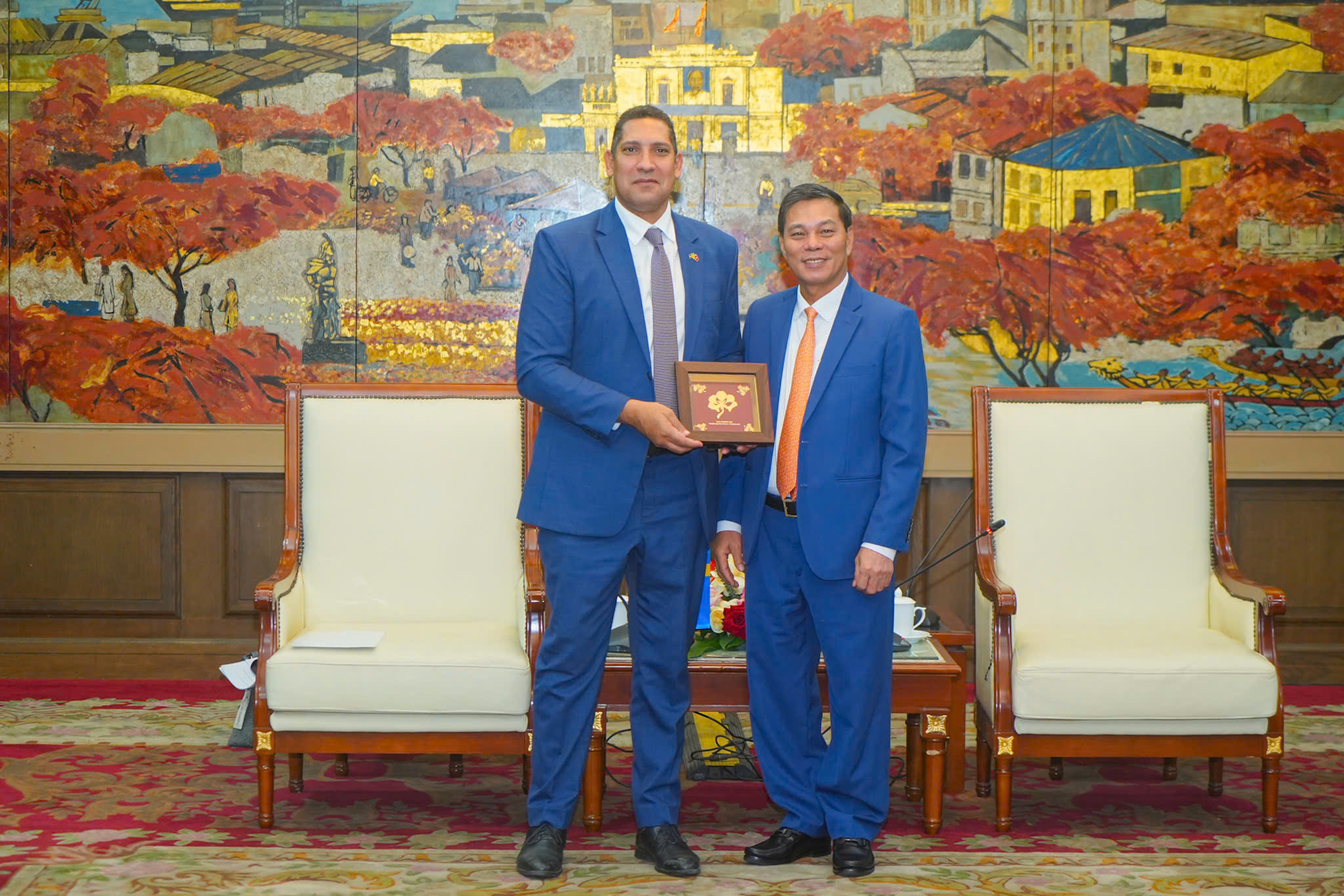 Chủ tịch UBND thành phố Nguyễn Văn Tùng trao quà lưu niệm của Hải Phòng cho Ngài Johan Ndisi, Đại sứ Thụy Điển.