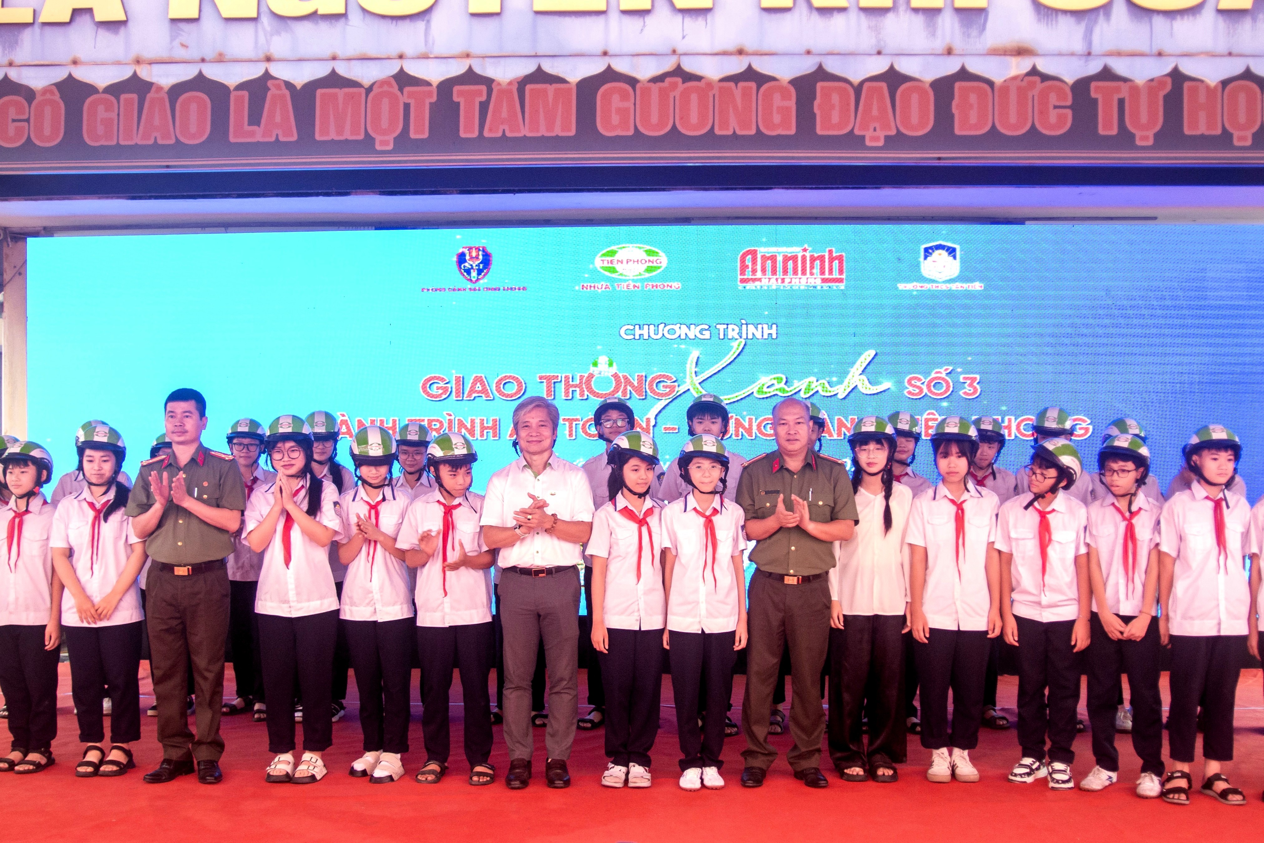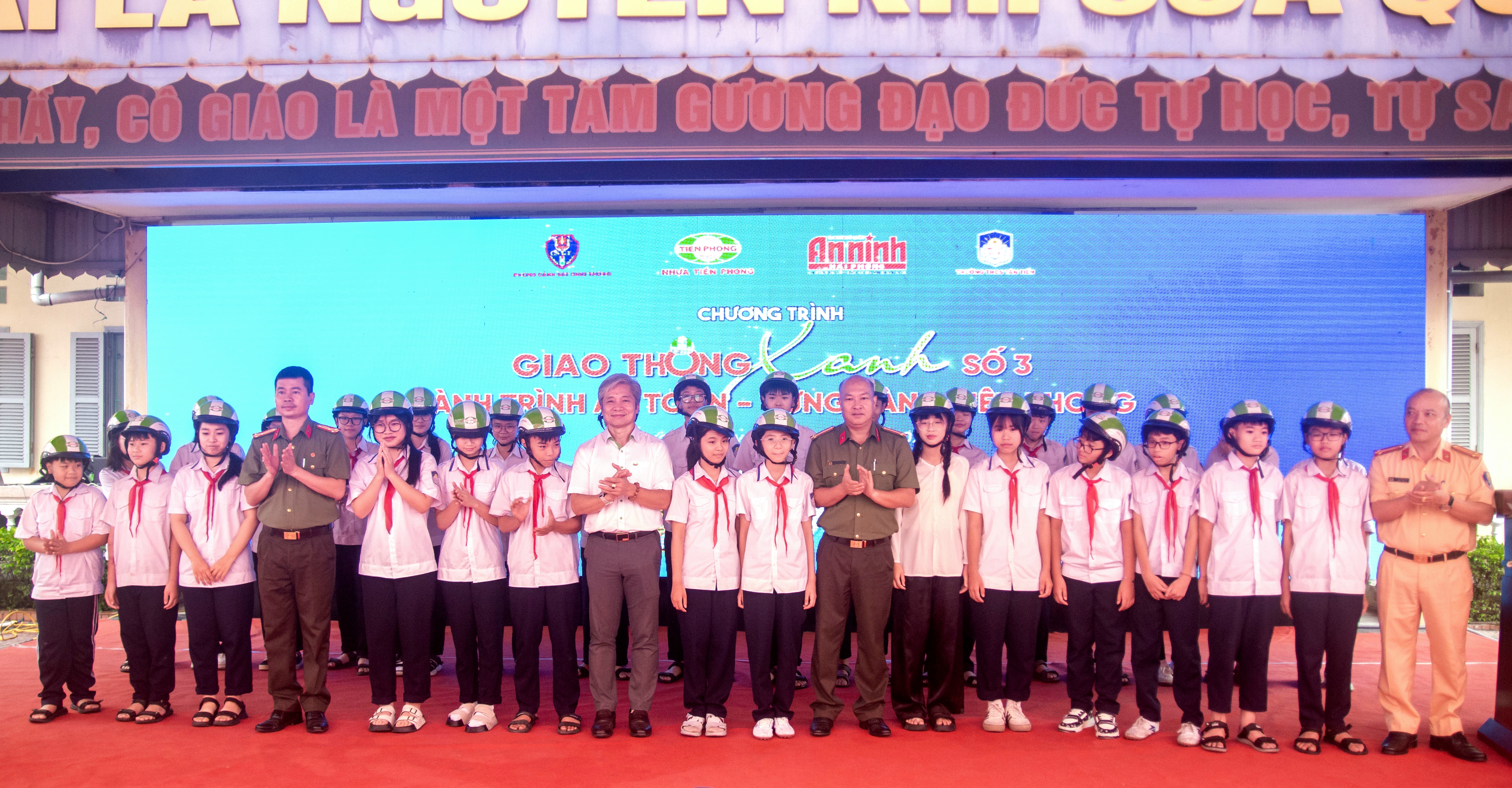 Các đồng chí lãnh đạo tặng mũ bảo hiểm và trao quà tặng 30 học sinh tiêu biểu của nhà trường.Chương trình “Giao thông xanh - Hành trình an toàn - Vững vàng tiên phong” số thứ 3 tiếp tục khẳng định hiệu quả của mô hình phối hợp giữa lực lượng Công an, doanh nghiệp và nhà trường trong công tác tuyên truyền, giáo dục pháp luật về an toàn giao thông. Qua đó góp phần xây dựng môi trường giao thông an toàn, văn minh, hình thành thói quen và ý thức trách nhiệm cho thế hệ trẻ ngay từ khi còn ngồi trên ghế nhà trường.