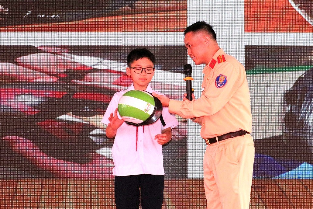 Thiếu tá Nguyễn Đức Ninh - cán bộ Đội tuyên truyền, xử lý Phòng CSGT hướng dẫn cách đội mũ bảo hiểm đúng cách. Tại chương trình, các đại biểu và học sinh cùng theo dõi phóng sự về chương trình “Giao thông xanh - Hành trình an toàn - Vững vàng tiên phong”. Những hình ảnh trực quan, sinh động đã góp phần khắc họa rõ nét ý nghĩa thiết thực của hoạt động trao tặng mũ bảo hiểm đạt chuẩn và tuyên truyền trật tự an toàn giao thông trong việc nâng cao nhận thức cộng đồng, đặc biệt là lứa tuổi học sinh về văn hóa giao thông an toàn.