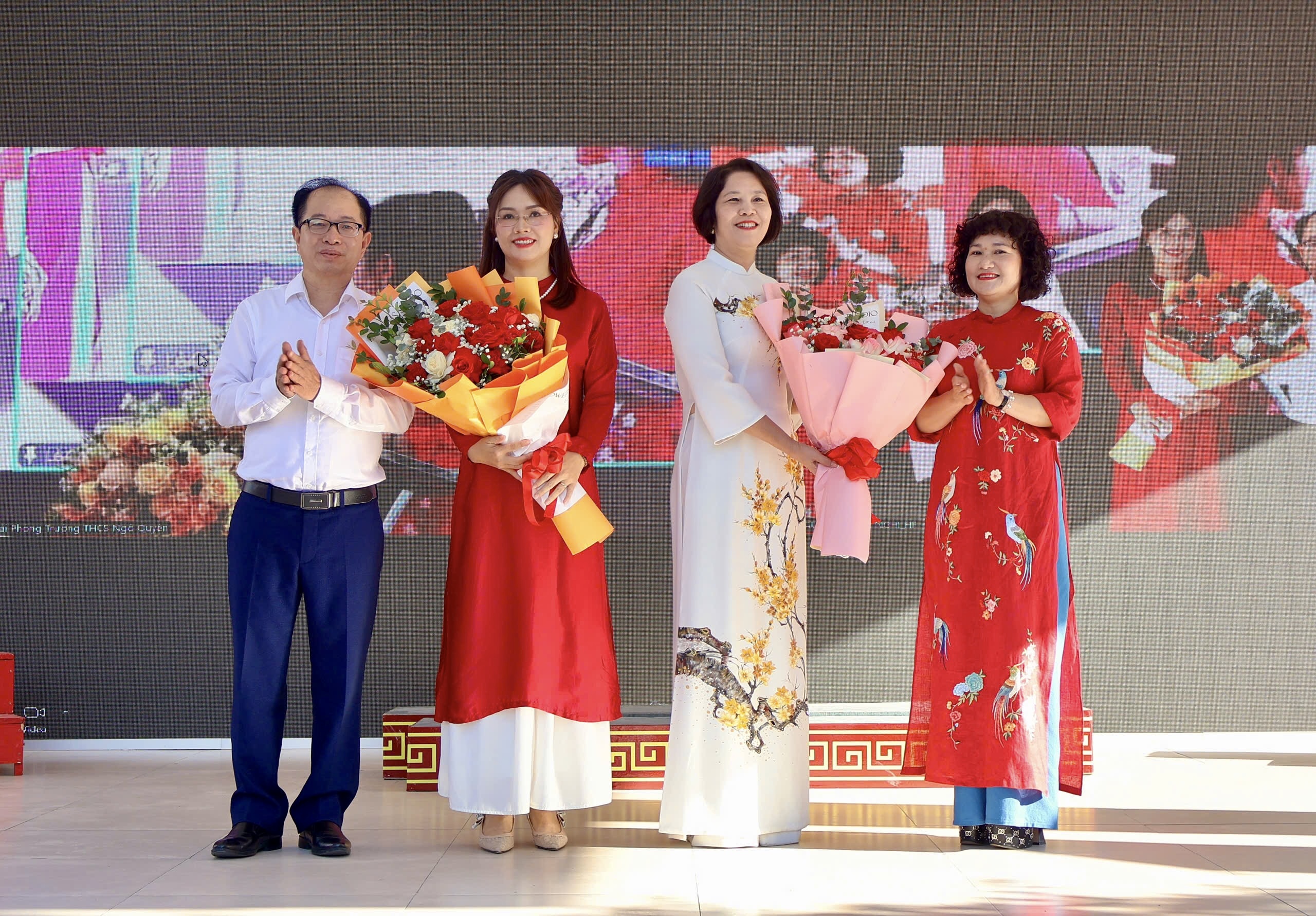 Lãnh đạo Sở Giáo dục và Đào tạo, phường Lê Chân tặng hoa chúc mừng Trường THCS Ngô Quyền.