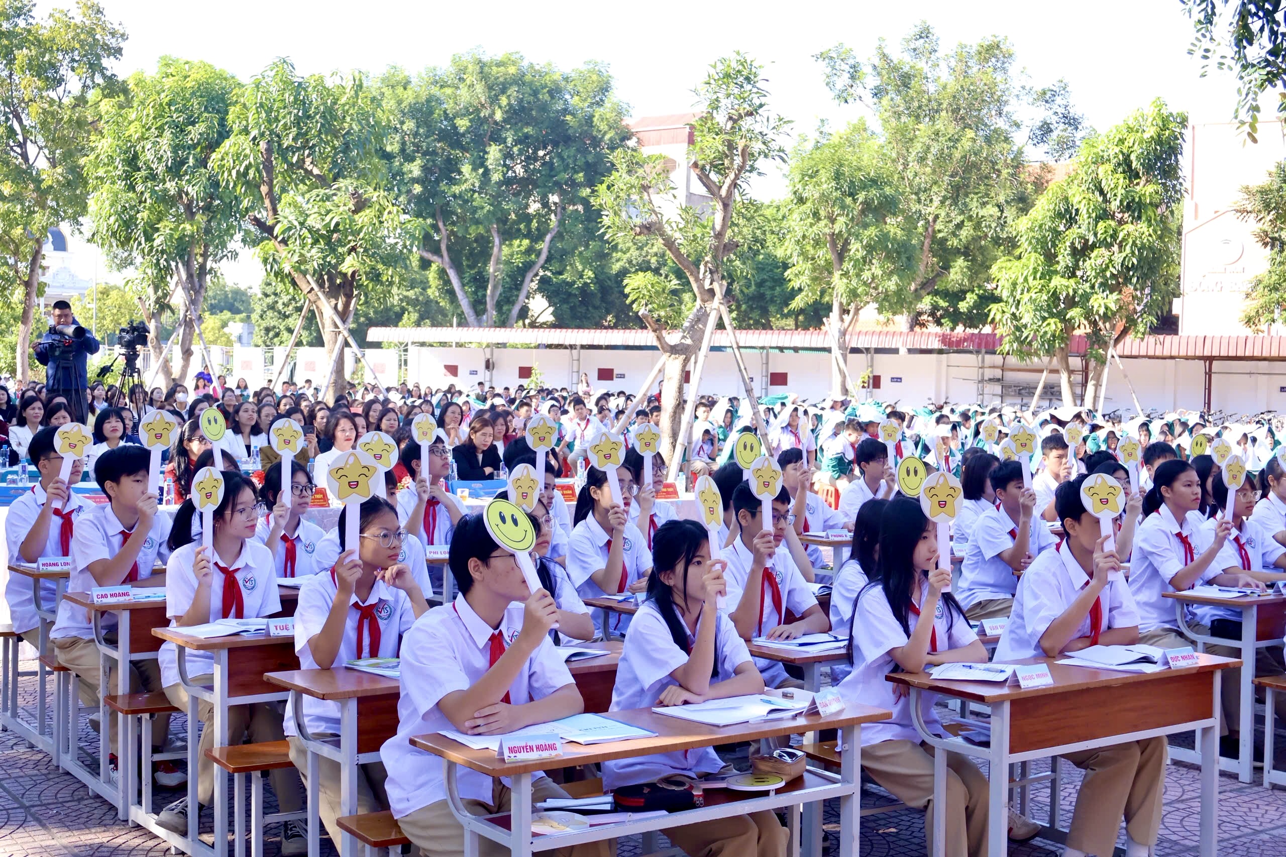 Trong tiết học tại Chuyên đề, học sinh 2 trường được tham gia nhiều hoạt động học tập, trải nghiệm phong phú: dự án, thuyết trình, tiểu phẩm, trò chơi trực tuyến, sản phẩm sáng tạo, video tư liệu... để vừa học, vừa cảm, vừa sống trong không khí tri ân thầy cô.