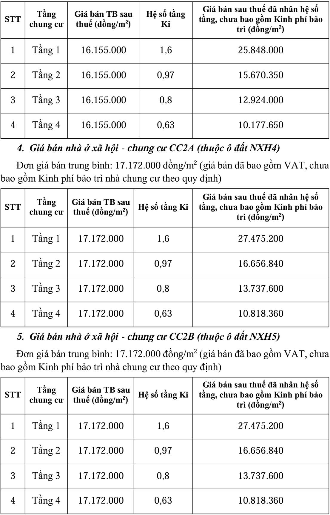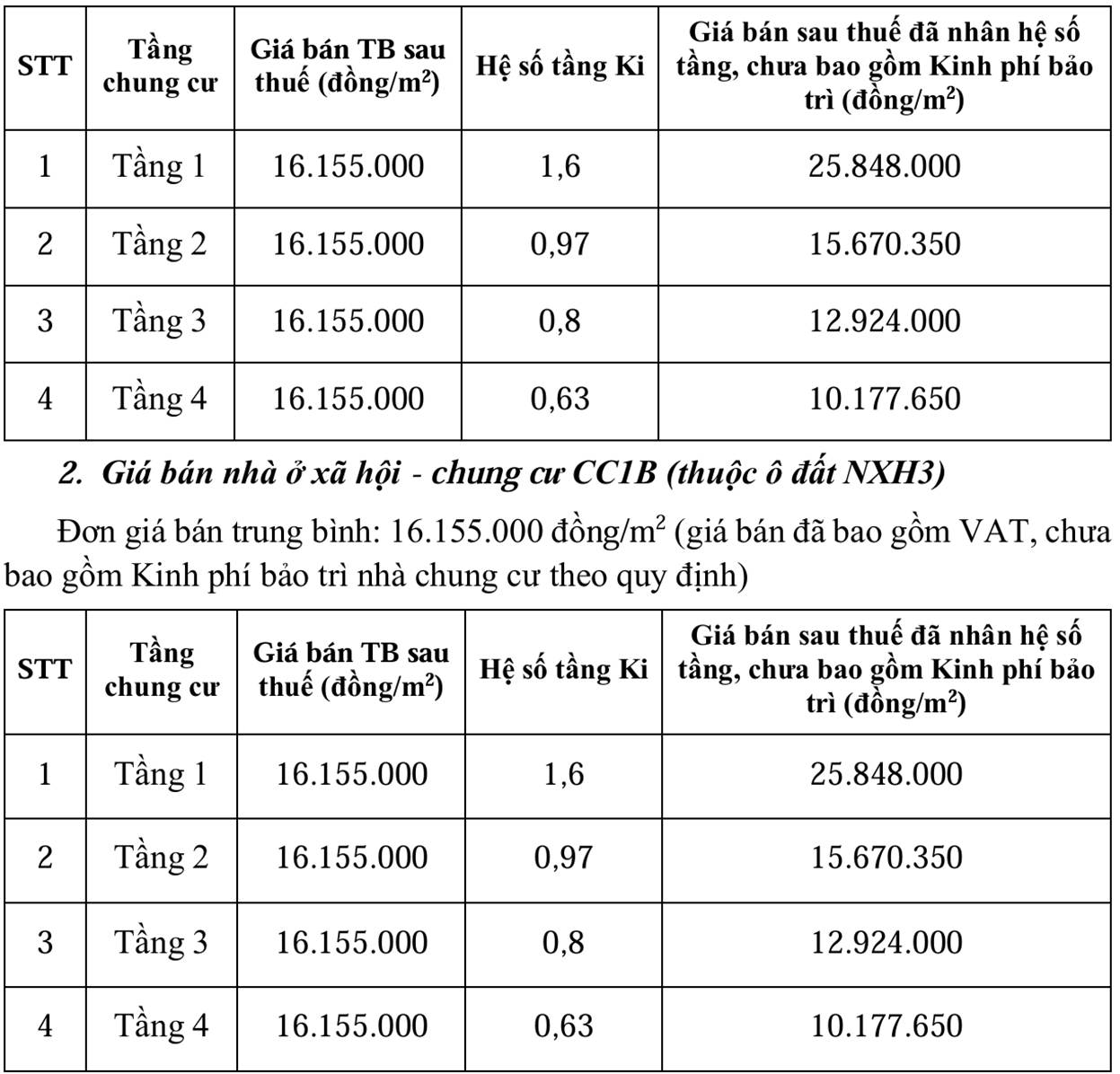 3. Giá bán nhà ở xã hội - chung cư CC1C (thuộc ô đất NXH3)