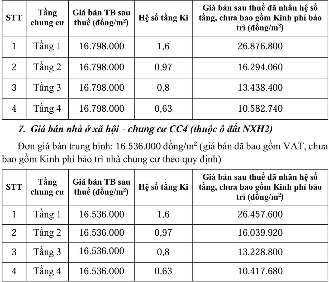 6. Giá bán nhà ở xã hội - chung cư CC3 (thuộc ô đất NXH1)