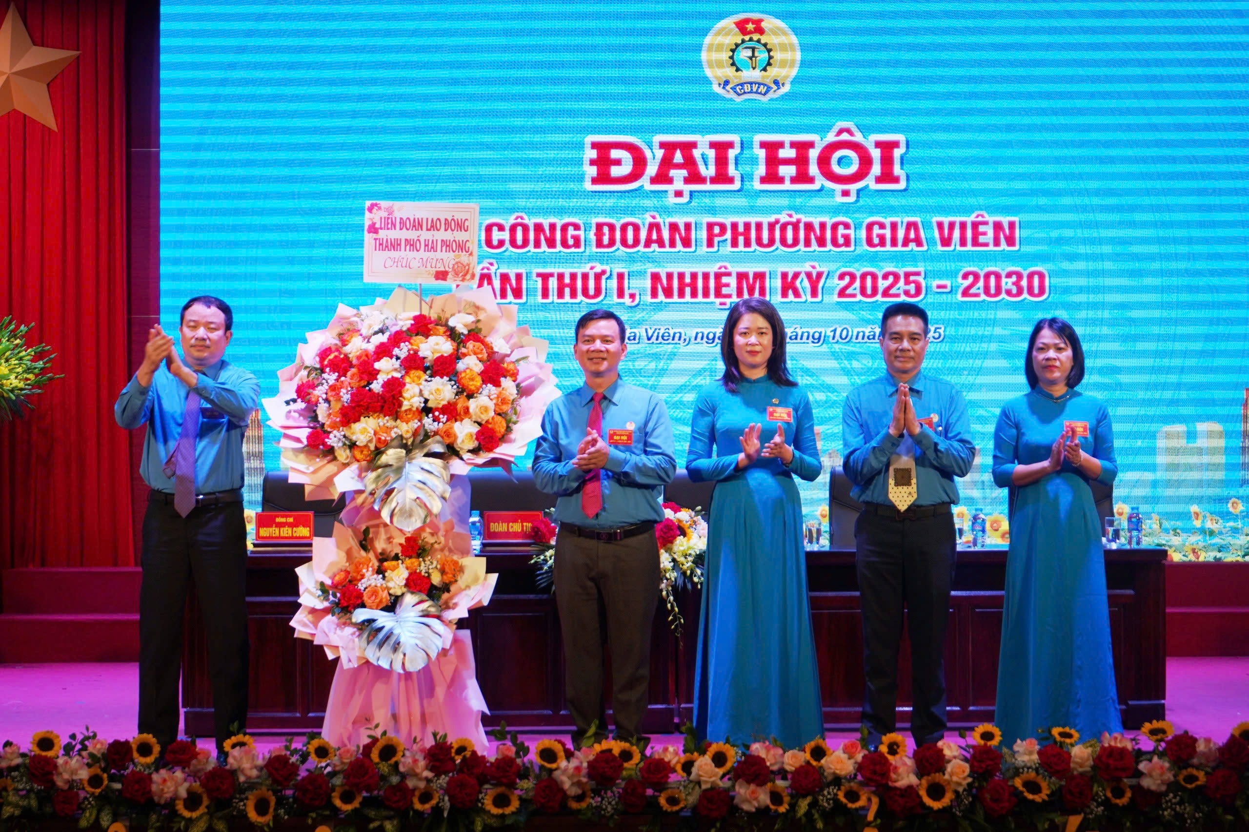 Đồng chí Nguyễn Anh Tuân, Chủ tịch Liên đoàn Lao động thành phố tặng hoa Đại hội.Phát biểu tại Đại hội, đồng chí Nguyễn Anh Tuân, Chủ tịch Liên đoàn Lao động thành phố, nhấn mạnh: Đại hội Công đoàn phường Gia Viên lần thứ nhất là sự kiện có ý nghĩa quan trọng, đánh dấu bước phát triển mới của tổ chức công đoàn phường trong bối cảnh thực hiện mô hình chính quyền địa phương 02 cấp. Đồng chí đề nghị, bước vào nhiệm kỳ 2025-2030, Công đoàn phường cần tiếp tục đổi mới mạnh mẽ, nâng cao chất lượng hoạt động, đồng hành cùng sự phát triển của địa phương; kịp thời nắm bắt tâm tư, nguyện vọng, chăm lo đời sống, bảo đảm quyền và lợi ích hợp pháp của đoàn viên, người lao động. Cùng với đó, tiếp tục ổn định tổ chức bộ máy, hoàn thiện nội quy, quy chế hoạt động, rà soát các doanh nghiệp trên địa bàn để tuyên truyền, vận động phát triển đoàn viên, thành lập công đoàn cơ sở tại những đơn vị đủ điều kiện. Trước mắt, Công đoàn phường cần sớm xây dựng kế hoạch chăm lo Tết cho đoàn viên, người lao động với tinh thần “Tất cả đoàn viên đều có Tết, không có đoàn viên bị bỏ lại phía sau”.