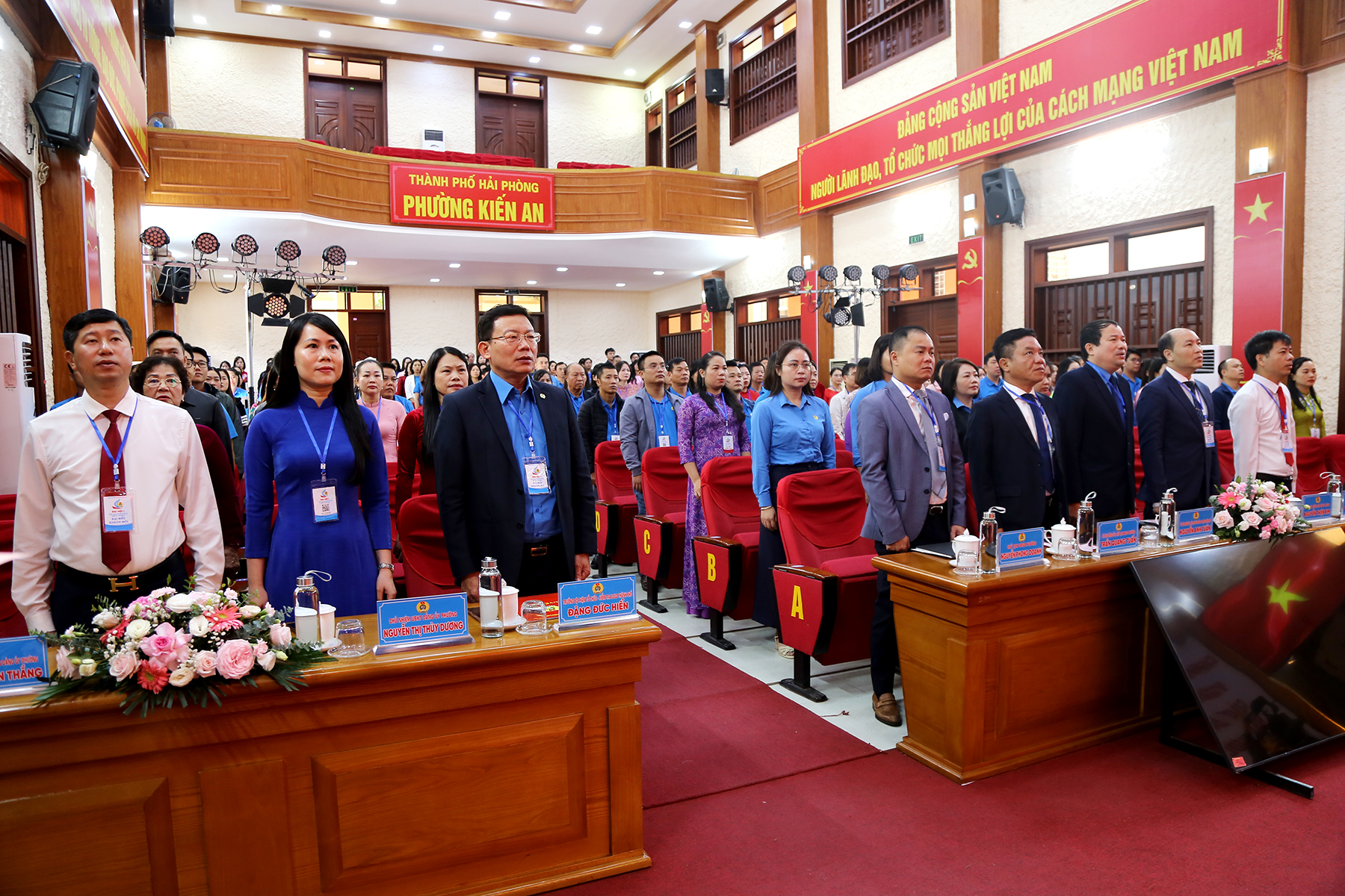 Đại biểu dự Đại hội thực hiện nghi Lễ chào cờ.Trong 3 tháng kể từ khi đi vào hoạt động, mặc dù còn nhiều khó khăn, song dưới sự chỉ đạo trực tiếp của Liên đoàn Lao động thành phố, sự lãnh đạo của Đảng ủy phường Kiến An, cùng với sự quan tâm, tạo điều kiện của HĐND, UBND, Ủy ban MTTQ và các đoàn thể chính trị - xã hội phường, hoạt động của Công đoàn phường đã đạt được nhiều kết quả nổi bật.