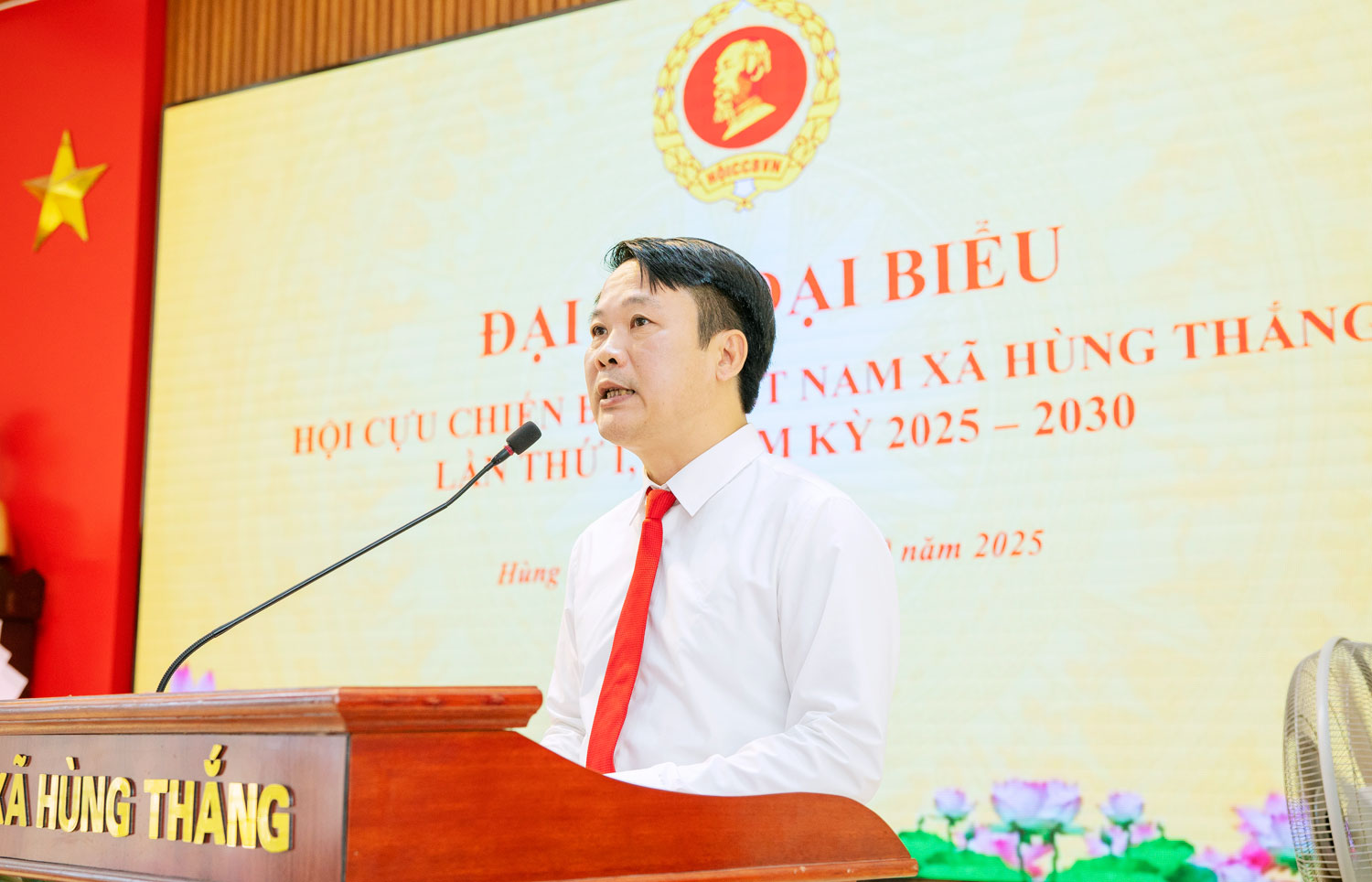 Đồng chí Nguyễn Anh Tú, Phó Bí thư Thường trực Đảng ủy xã Hùng Thắng phát biểu chỉ đạo tại Đại hội.Phát biểu chỉ đạo Đại hội, đồng chí Phạm Công Lục, Phó Chủ tịch Hội Cựu chiến binh thành phố và đồng chí Nguyễn Anh Tú, Phó Bí thư Thường trực Đảng ủy xã Hùng Thắng ghi nhận, biểu dương những kết quả Hội Cựu chiến binh xã đạt được trong nhiệm kỳ qua; đồng thời đề nghị Hội tiếp tục phát huy truyền thống “Trung thành – Đoàn kết – Gương mẫu – Đổi mới”, tiếp tục là lực lượng nòng cốt trong phong trào thi đua yêu nước, phát huy vai trò gương mẫu trong học tập và làm theo tư tưởng, đạo đức, phong cách Hồ Chí Minh; nhân rộng các mô hình “Cựu chiến binh gương mẫu”, “Cựu chiến binh tham gia xây dựng nông thôn mới nâng cao, kiểu mẫu”, góp phần củng cố niềm tin của Nhân dân vào sự lãnh đạo của Đảng, xây dựng quê hương Hùng Thắng ngày càng giàu đẹp, văn minh.
