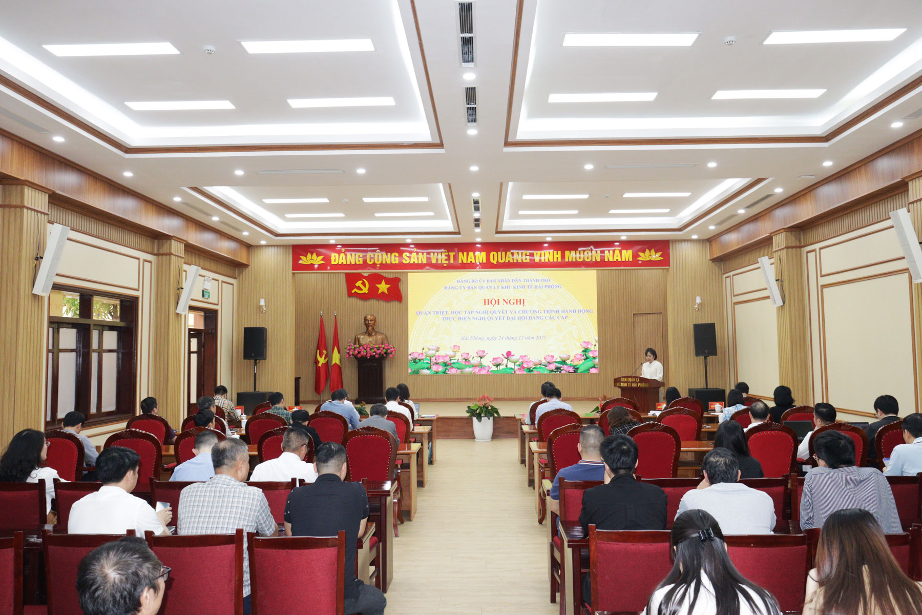 Quang cảnh Hội nghị.Phát biểu chỉ đạo tại Hội nghị, đồng chí Trưởng Ban Quản lý Khu kinh tế Hải Phòng đề nghị các Đảng bộ, Chi bộ trực thuộc cần tập trung quán triệt Nghị quyết Đại hội đại biểu Đảng bộ Ban Quản lý Khu kinh tế Hải Phòng lần thứ I, nhiệm kỳ 2025 - 2030 đảm bảo sự thống nhất cao trong nhận thức và hành động của các cấp ủy trực thuộc, cán bộ, đảng viên, đoàn viên, người lao động trong toàn Đảng bộ, quyết tâm triển khai thực hiện thắng lợi các chỉ tiêu Nghị quyết đã đề ra.