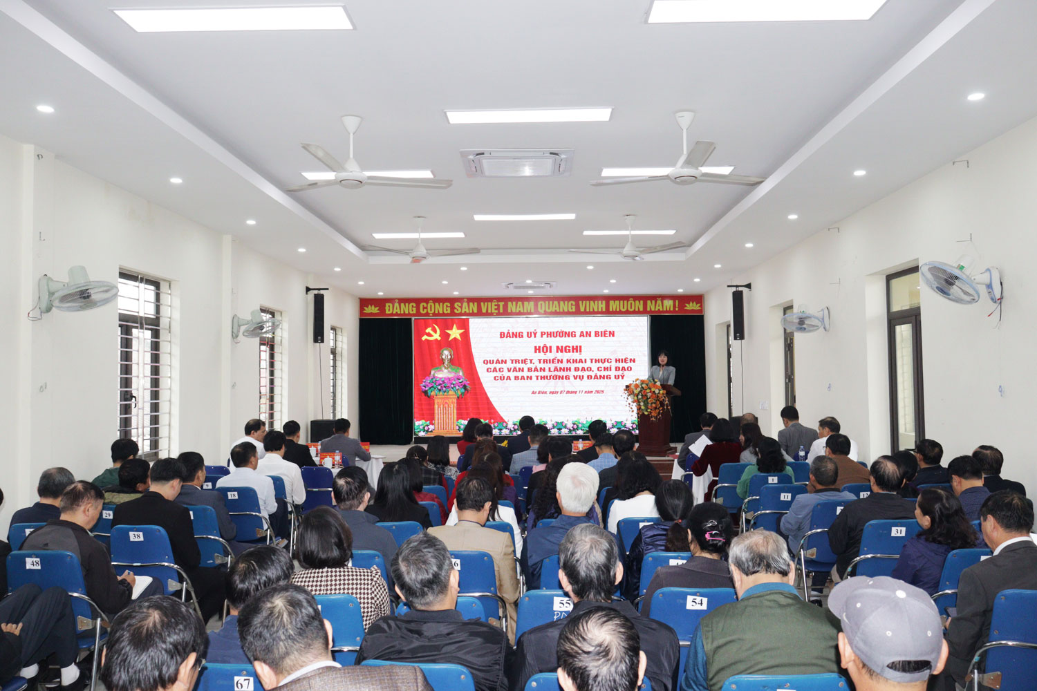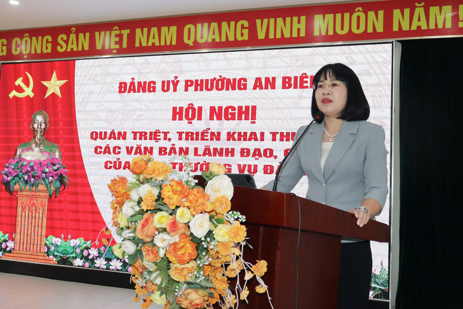 Đồng chí Nguyễn Thị Tịnh, Phó Bí thư Đảng ủy, Chủ tịch UBND phường quán triệt tại Hội nghị.Đây là những văn bản mang tính định hướng, có vai trò then chốt trong việc nâng cao năng lực lãnh đạo, sức chiến đấu của Đảng bộ phường, góp phần xây dựng phường An Biên phát triển toàn diện, văn minh, hiện đại.